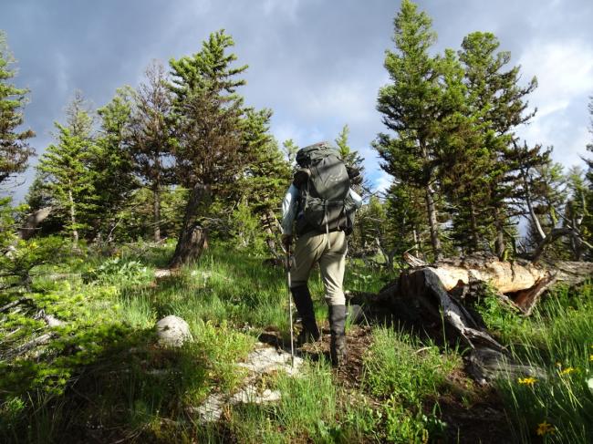 Hike north from the N. Fork Trailhead. We turned left (west) on Tr. 061 (Lake Creek Trail) after about 0.6 miles to combine this summit with Spread Mountain (W7M/GA-079), but it is more direct to continue up the North Fork of the Blackfoot, and then turn left (west) up the Dry Fork after reaching the North Fork Cabin. The trails up the North Fork and the Dry Fork are heavily used and get cleared early in the season.