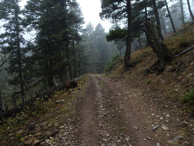 Go east for 5.4 miles on highway 12 and turn right (south) on FS-694 at Pasture Creek. Follow FS-694 1.5 miles to the hairpin at the junction with FS-694A. Following FS-694 around the hairpin is likely the preferred choice before September-1, as this is a good road that leads to a trailhead that is near the summit ridge. The road is, however, only open for motorized use from 12/02 to 8/31. It is gated and signed just past the 2nd hairpin during the off-season. We continued straight at the 1st hairpin along Pasture Creek on FS-694A for another 2.8 miles to a trail junction and camping area that is a good parking area for full-sized vehicles. FS-694A is open to motorized use all year but will be impassable during much of the winter.