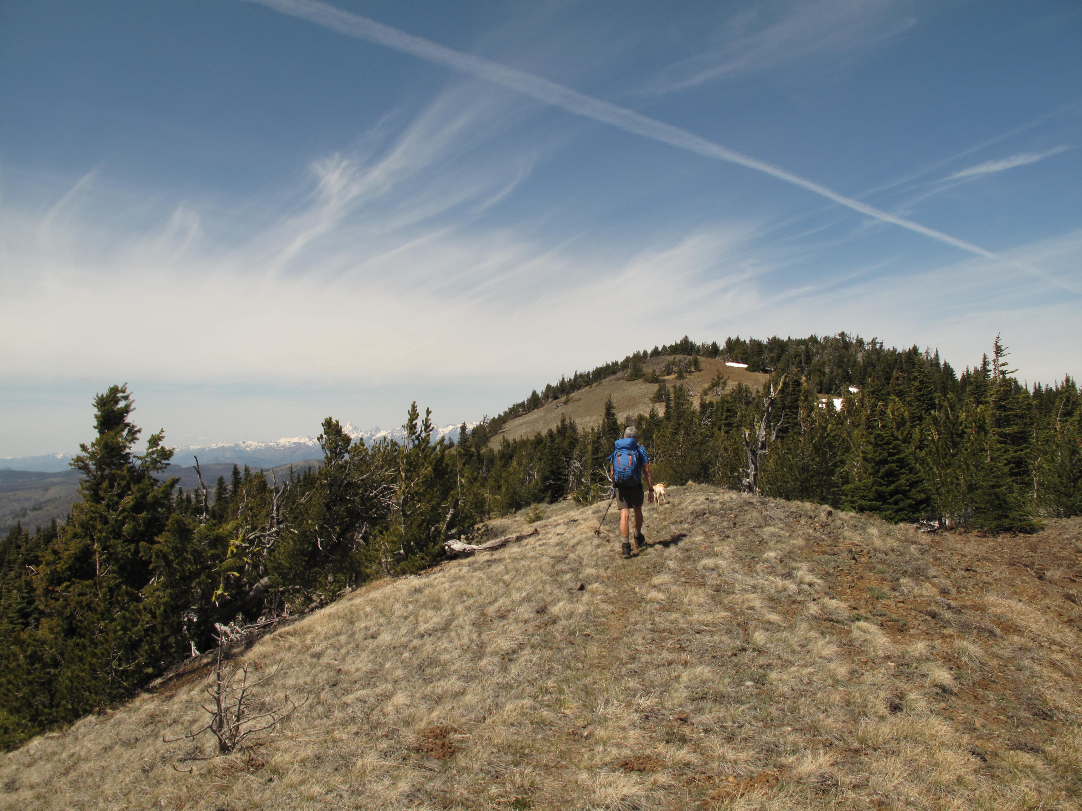 Mission Peak is an 8 point SOTA summit, 6,876 feet / 2,096 meters, with about 2300 feet gain, including some up and down sections. The distance travelled was approximately 7 to 8 miles RT. It is located above the Mission Ridge Ski Resort, south of Wenatchee. See: MR1314_TrailMap.pdf. There are several ways to reach the summit. We elected to travel through the ski area, as the ski season was officially over on April 13th. There were several other parties on the mountain, some desperately seeking upper slope ski runs, on the rapidly disappearing snow, others hiking up the mountain with saucer sleds in order to partake in a little springtime snow play. Higher in the central cascades, and on the large volcanoes, there is still snow to be had for those seeking better quality snow.