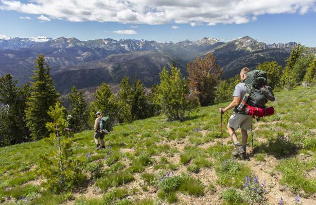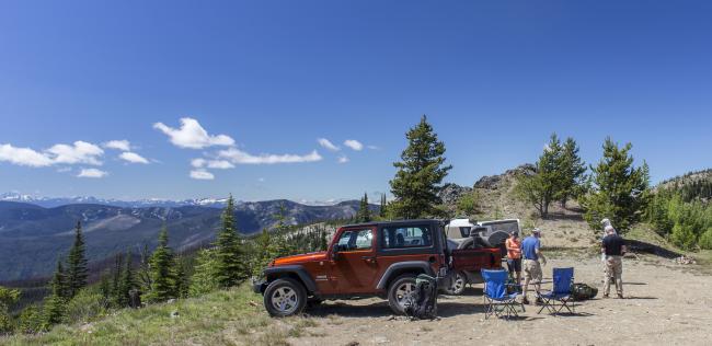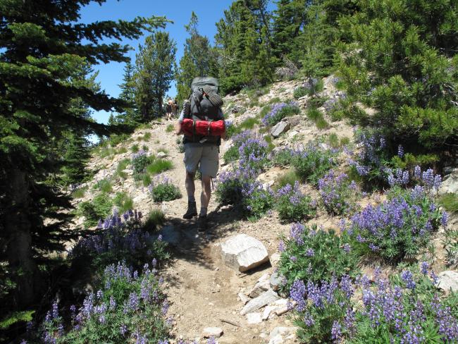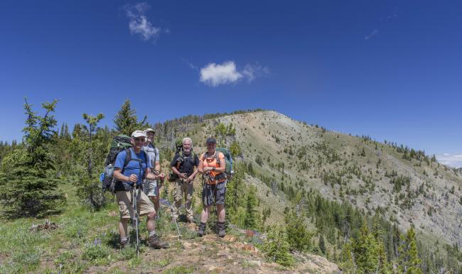 Day 1 activities included hefting our heavy packs to the summit of Crow Hill for our first Activation, then descending back to the trail and moving on to locate Camp 1. The summit of Crow Hill is a mere 500 or so feet above the trail, through flowered meadows going up the west face. TH to Crow Hill summit was about 1,000 feet gain. Both KG7EJT and I soon succeeded in the Activation, and the group decided to keep moving. We were unsure of the exact location of Camp 1, which importantly depended on the availability of water on this high ridge. Moving generally northward on Wenatchee National Forest Trail 1443, we stayed on the west side of the crest of the Chelan Mountains. Walking through miles of jaw dropping vistas and acres of wild flowers in bloom, we could not imagine a better place to be. Our first option for a camp, recommended by the Chelan Ranger Station, was a Col just north of Graham Mountain at about 6,650 feet. When we arrived, we found the area dry as a bone. Two of us dropped west into the headwaters basin of Corral Creek to look for a water source. We soon found one about 150 feet below the trail in a spring trickling out of the hill. Meanwhile, two others of the group continued on Trail 1443 turning westward, and in about ½ mile found an established campsite with a good water source. There we established what would be the only camp location, where we spent 2 nights. Having spent 4½ hours in transit to the TH and hiked 6½ miles, with an aggregate elevation gain of 2,260 feet, and completing an Activation - we were very happy with the results of our first day out. Over a hearty dinner, we planned out our next couple days.
