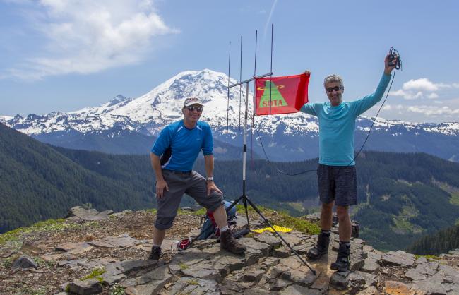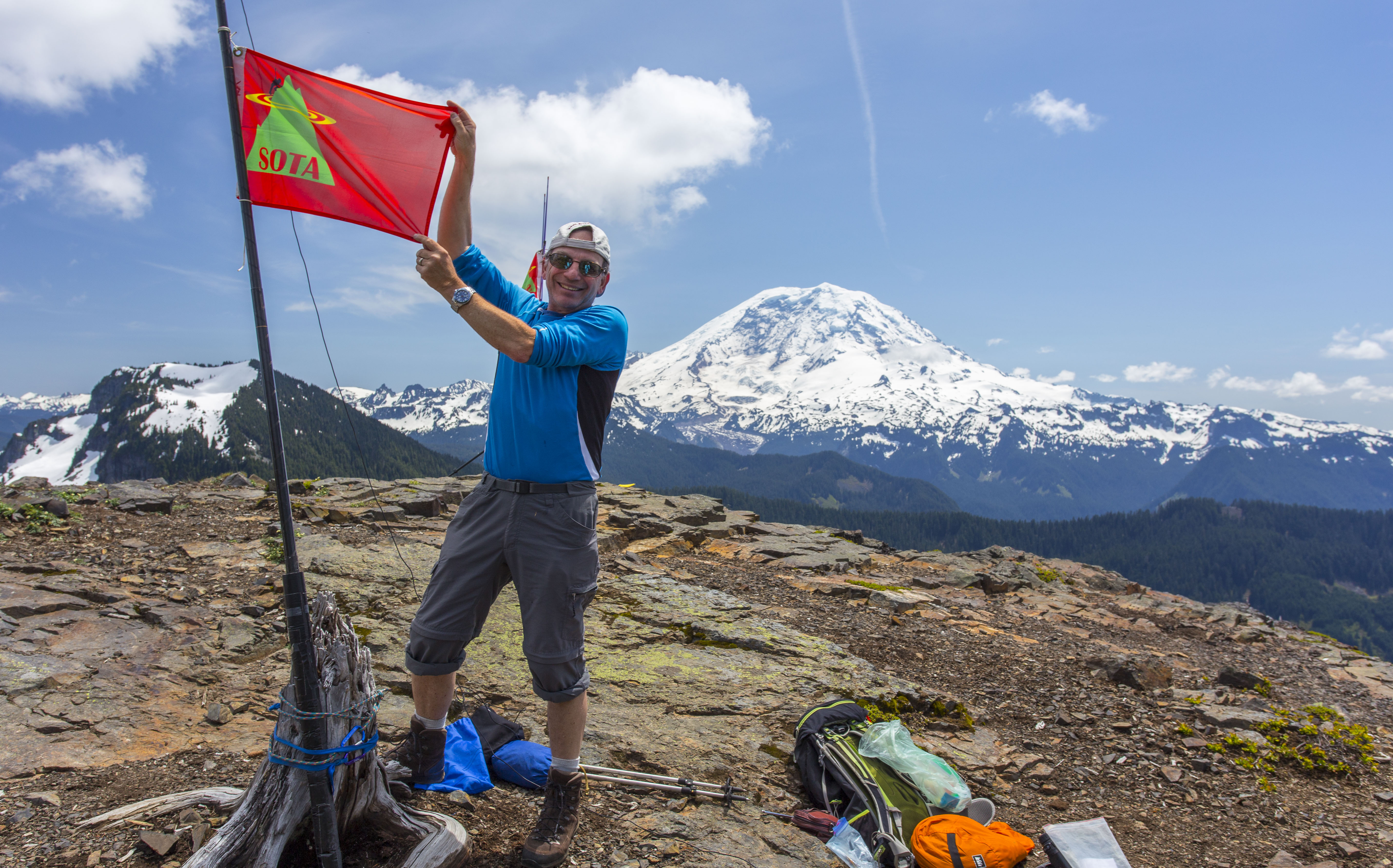 A fantastic Activation together with my SOTA Buddy, Tim, KG7EJT, along with his wife Masako, my wife Sharon & Dexter the SOTA Dog on Memorial Day 2016. Great weather, fantastic views from the summit and a successful SOTA Activation for both of us, yielded a memorable outing. "Mount Attenuator", mostly known as Summit Lake Peak, is approximately 3 miles north of Mount Rainier National Park. Thus it affords incredible sweeping outlook of the north aspect of mighty Mount Rainier. Mount Attenuator is 5,780 feet (1,762 meters) high, and is reached via approximately 6.1 mile RT trail. Elevation gain is approximately 1,360 feet.