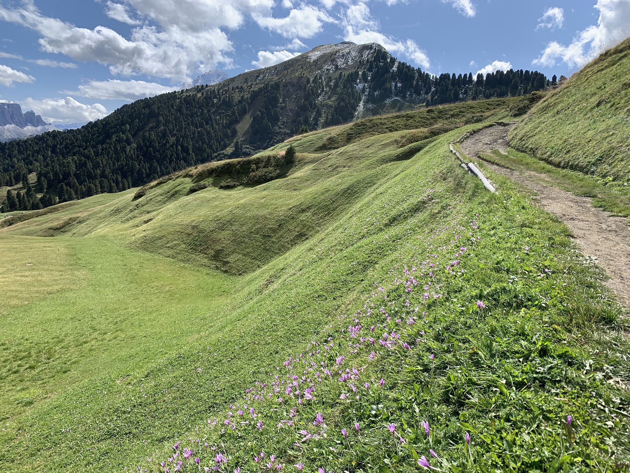 From the proximity of a small sub-village named Wolkenstein (this reminded us of a cross between Frankenstein and Werewolfstein), the Cable Railway whisked us from the base station at 1,550 Meters (5,085 Feet) to 2,100 Meters (6,890 Feet) in a matter of minutes. From there we completed a classic circuit hike, of 9 KM (5.4 Miles) and an ascent of 316 meters (1,037 Feet) and decent of 856 Meters (2,808 Feet). See map attached as photo, below. The circuit route took us back to the Col Raiser Station, where reversed our inter-modal transport back to the hotel in Selva. The views were remarkable! The hike was generally below tree line, through golf course like green meadows, which are also ski slopes in winter.