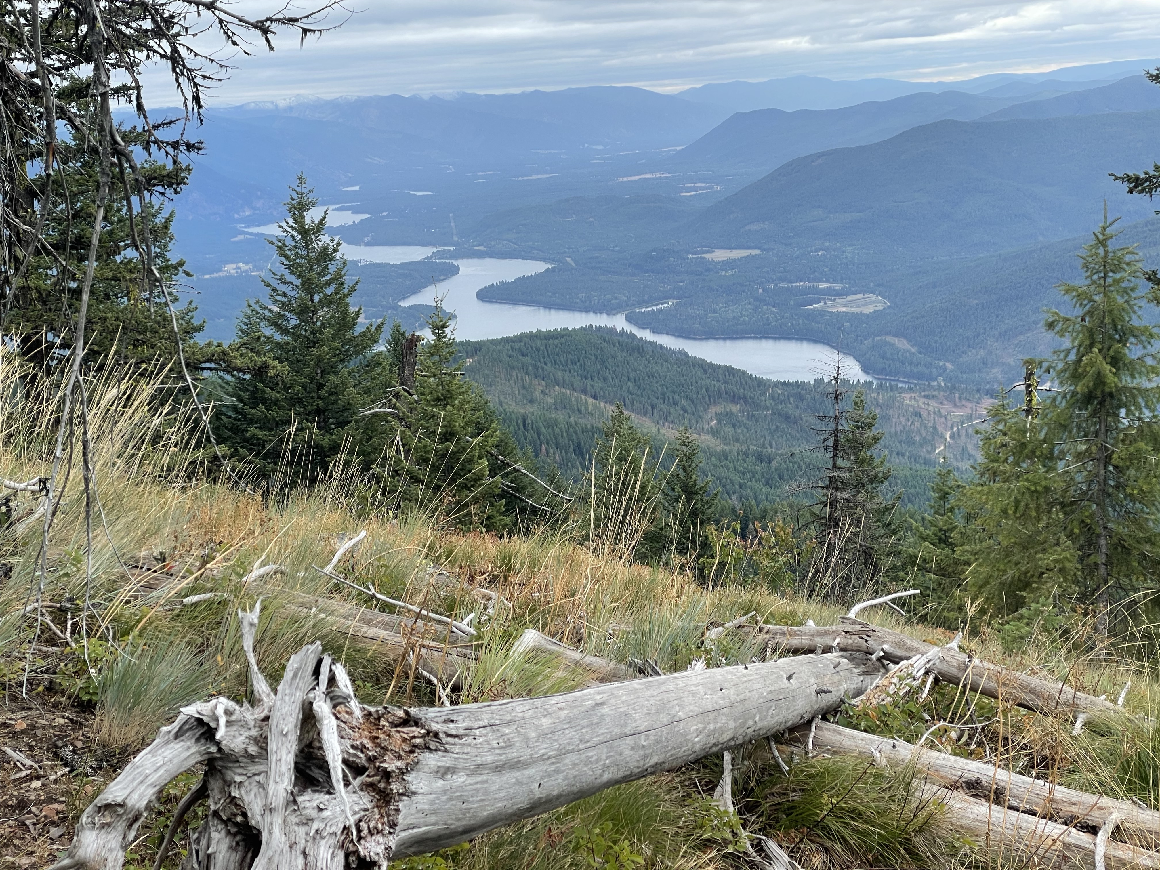 Stevens Peak is a forested summit overlooking Noxon Reservoir on the Clark Fork River. Much of the summit hike is along good loop Stevens Ridge Trail #1083. The summit is south of the small community of Noxon, Montana and the Noxon dam. The summit is a broad forested flat but there are good views of Noxon Reservoir and Cabinet Mountains on the northeast side of the summit where trees give way to steep rocky and grassy areas.