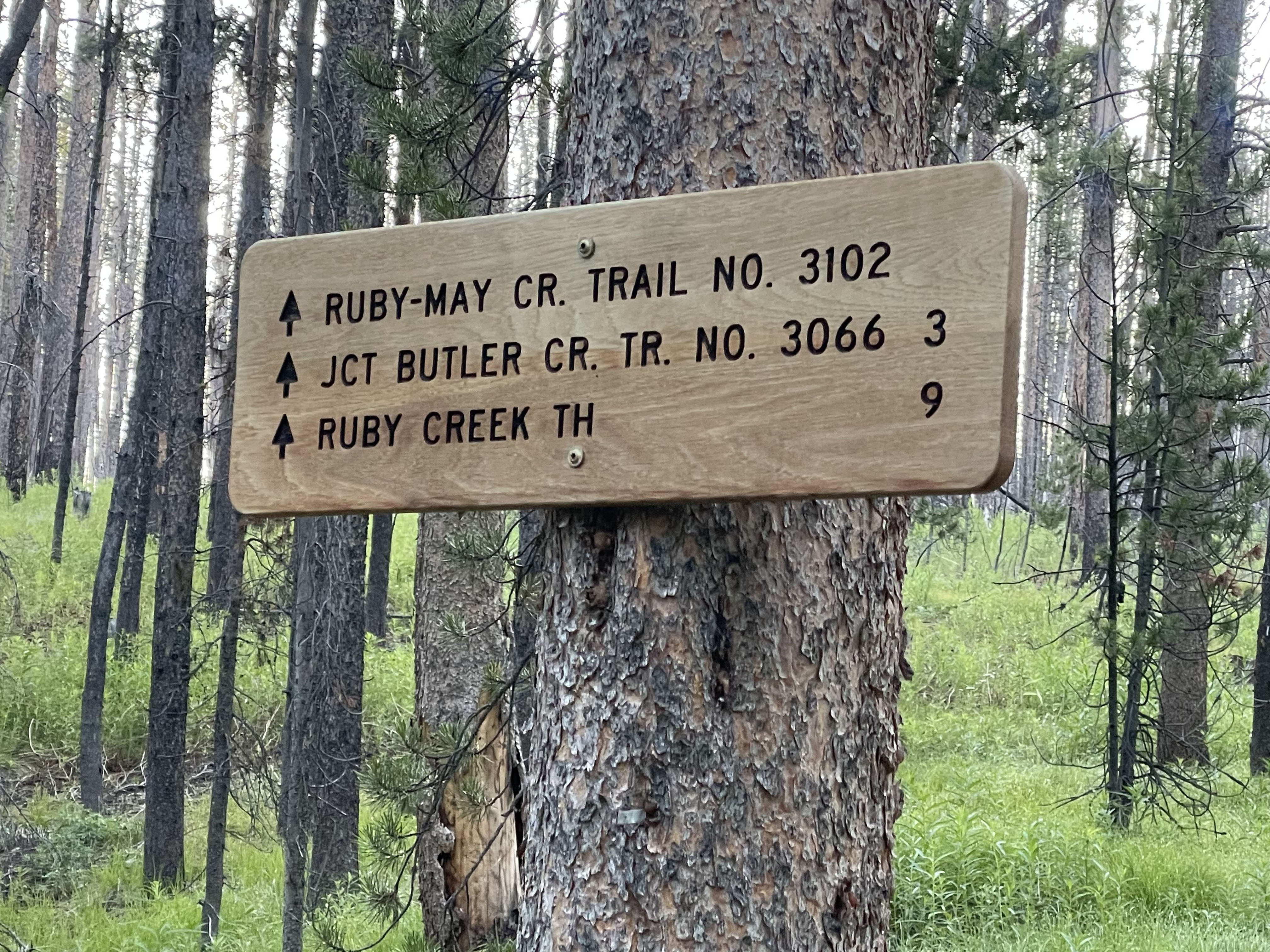 Summit #7845 is a good hike through the 2021 Trail Creek wildland fire. The trail signed Ruby-May Creek #3102 was in great shape and being cleared by a Montana Conservation Corps crew during the activation. There are some good views of the Anaconda-Pintler Wilderness summits along the trail.