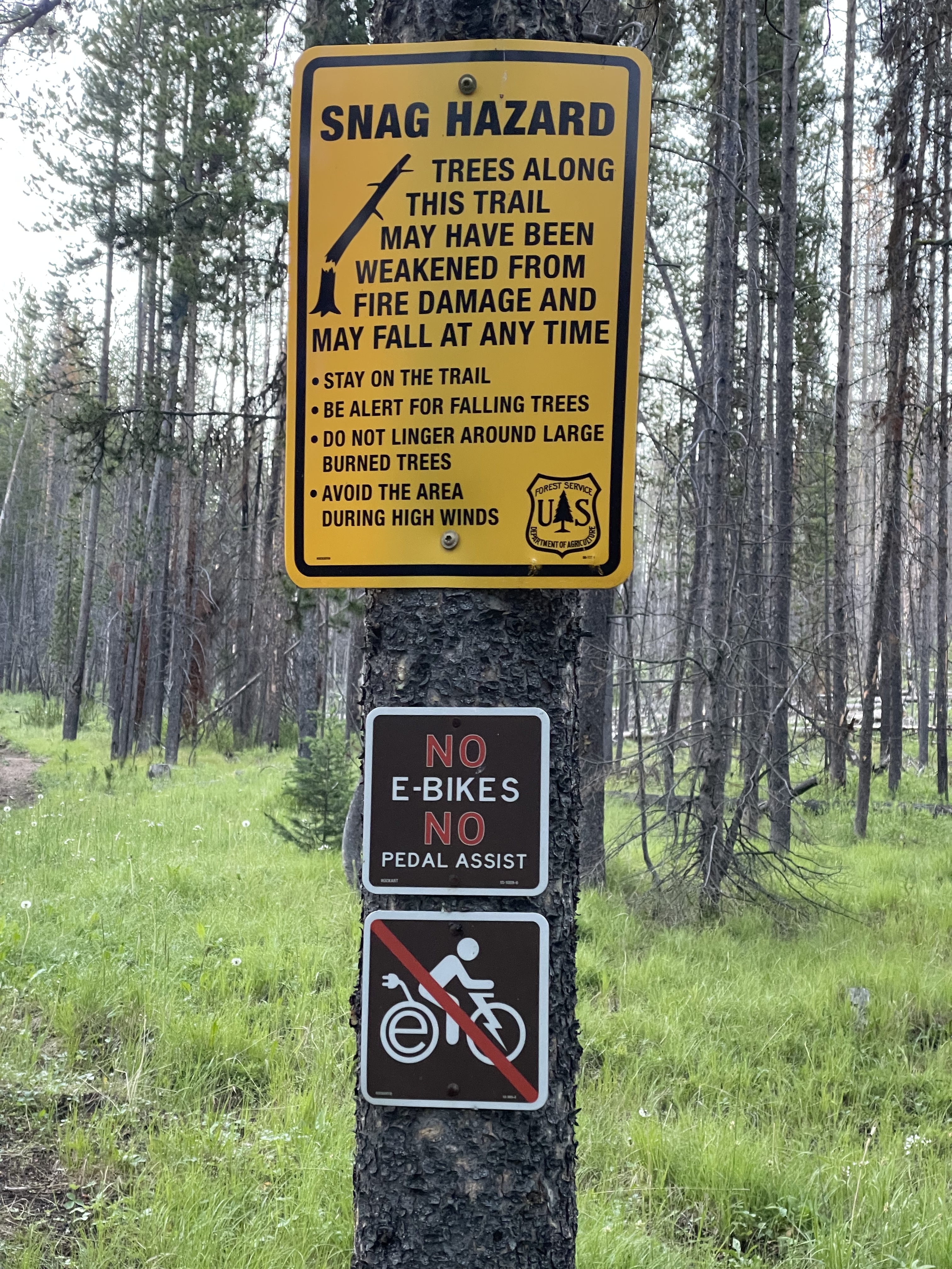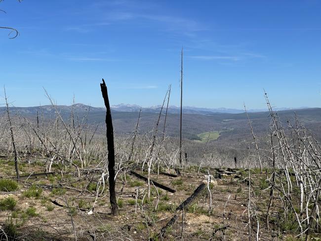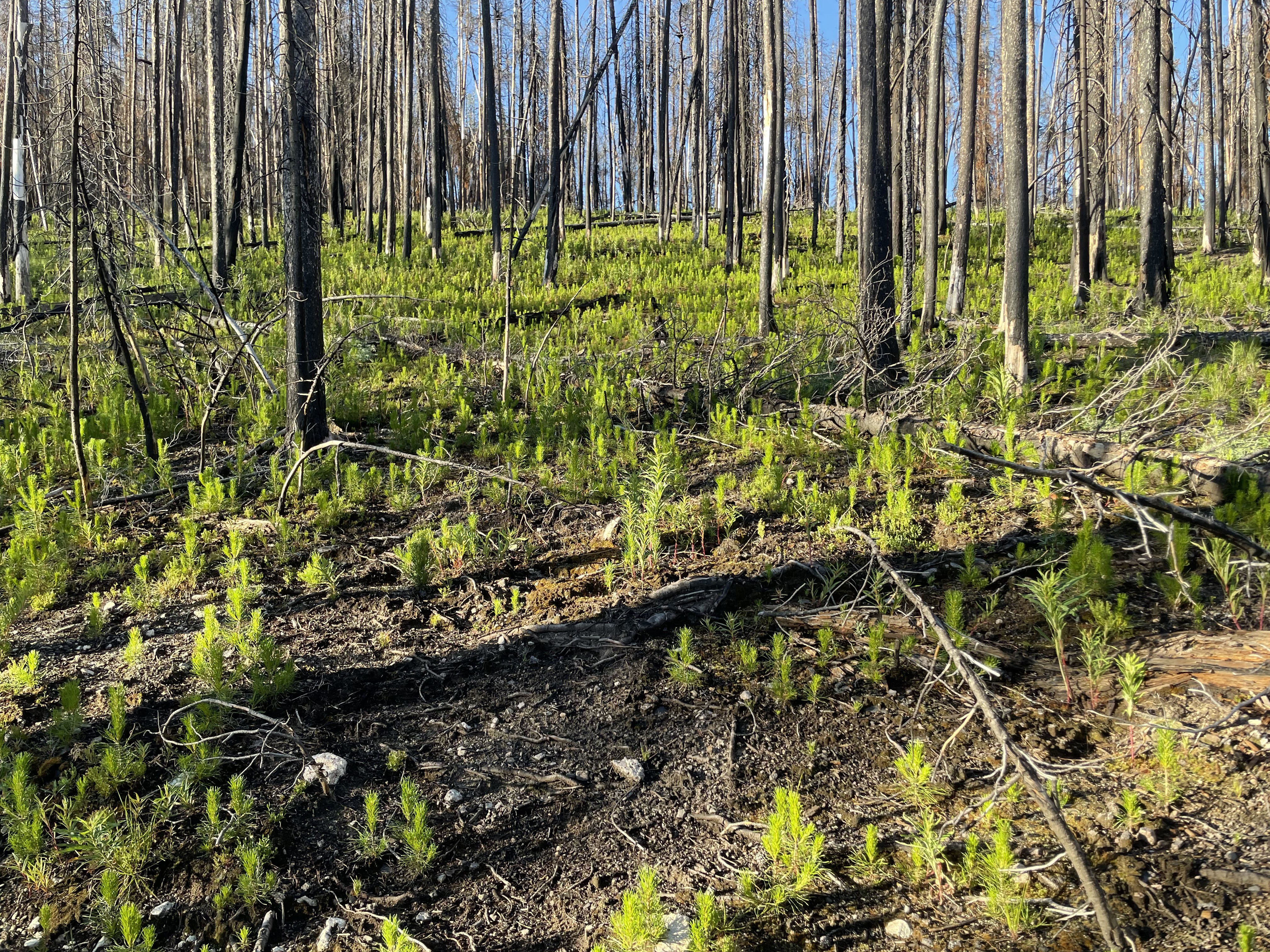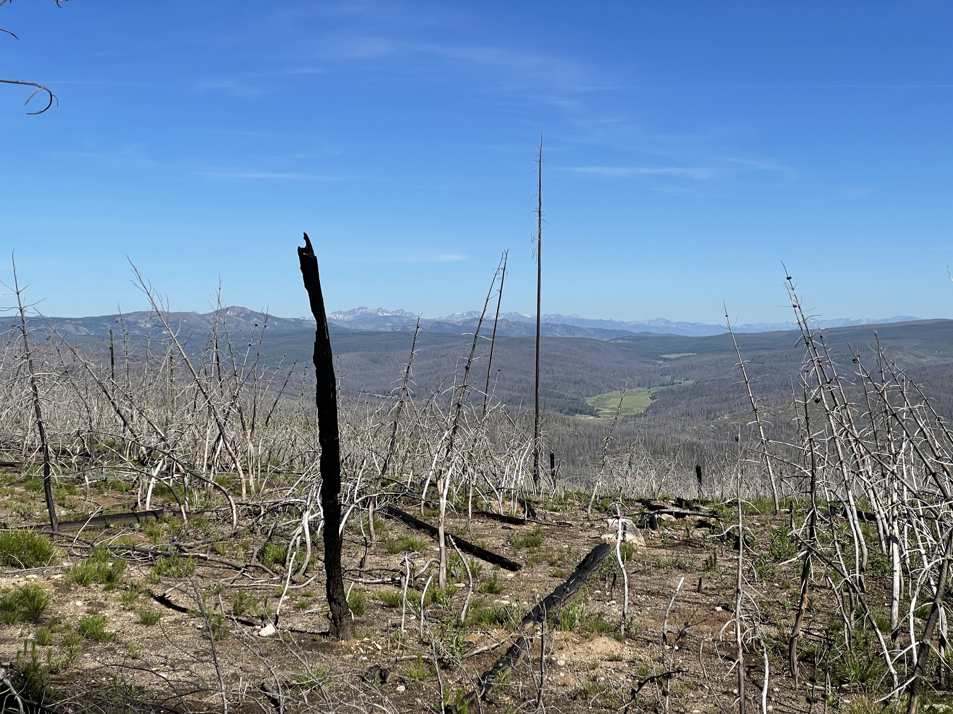 There is an unburned clump of larger lodgepole pine within the activation zone, eastside, for hanging wire antennas. This small, unburned area just short of the summit is also better refuge from the snag hazard. The actual summit is either burned forest or dense young lodgepole pine saplings with snags from an older wildland fire. Thousands of lodgepole pine seedlings per acre on the burned area will make this a dense forest again in 20-30 years.