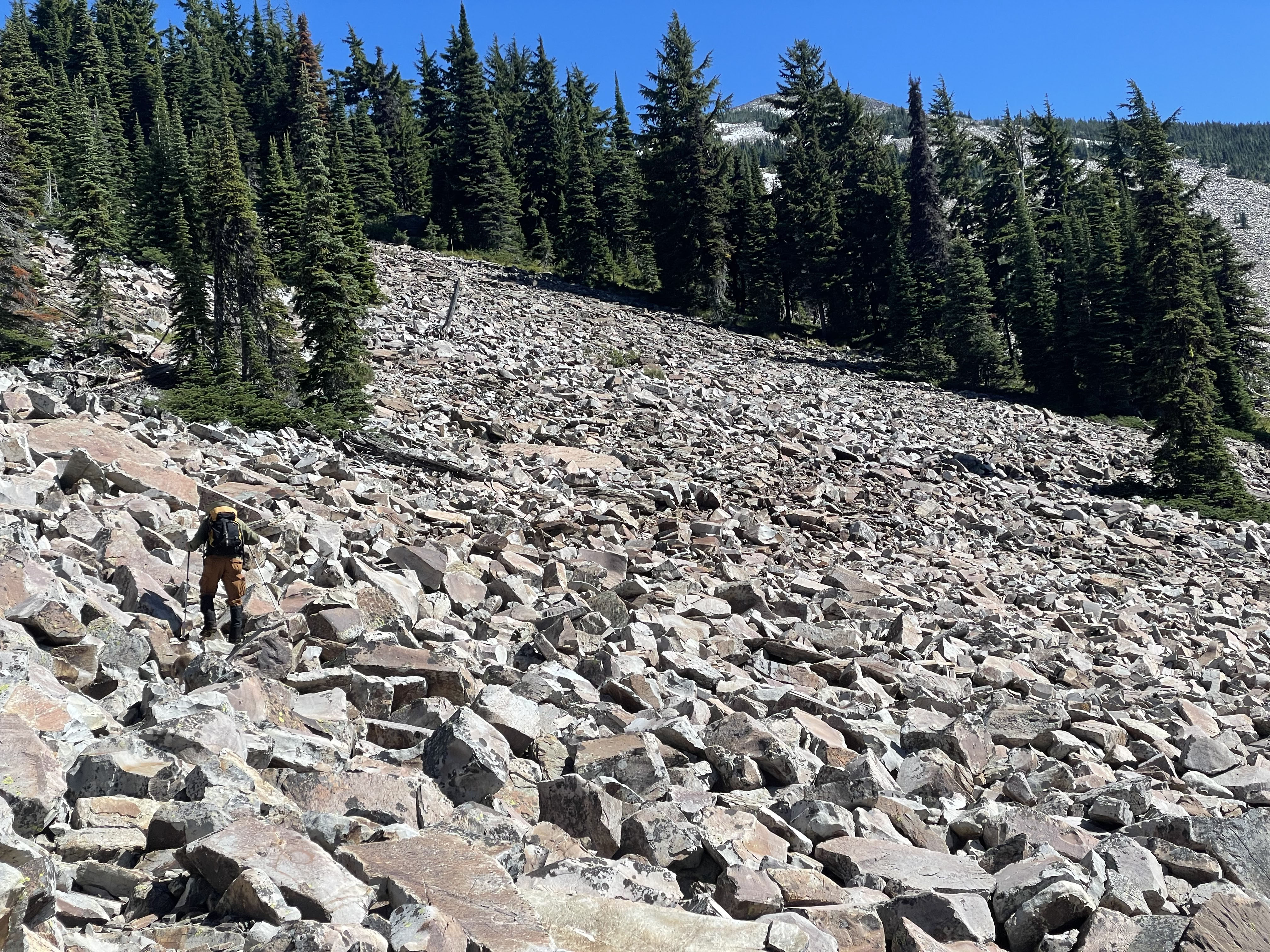 The trail climbs initially through old timber harvest units of densely regenerated young mature forest intersecting or following several old logging roads or skid trails. Soon however the trail enters older forest of mostly mountain hemlock well-spaced with an understory of shrubs dominated by tall black huckleberry, current and Rhododendron menziesia. The trail intersects the less steep main ridge and the Wilderness boundary at about 1.3 miles. Further along this ridge the trail drops into a more recent wildland fire. After dropping 0.5 miles through this old wildland fire and a short section of old forest the trail steepens up the last 1300’ of elevation gain to the summit over a well-defined switch-backing trail in mostly large boulders and talus.