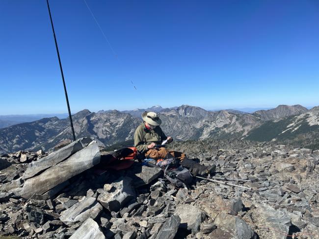 Engle Peak summit is exposed with bedrock and large loose rock piles suitable for supporting antenna poles.