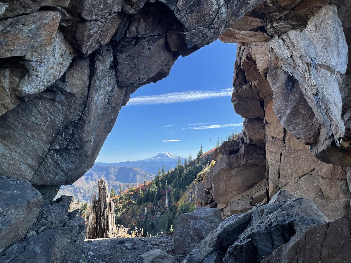Started from Johnson Observatory parking lot (day or annual permit required) on Boundary Trail #1 which leads around the rim of the bowl before ascending to the summit. There is a pretty cool trail section that leads through a rock archway along the way. The hole in the rock perfectly frames Mt Adams. Under the right conditions, you can actually see that hole from the Observatory parking lot.