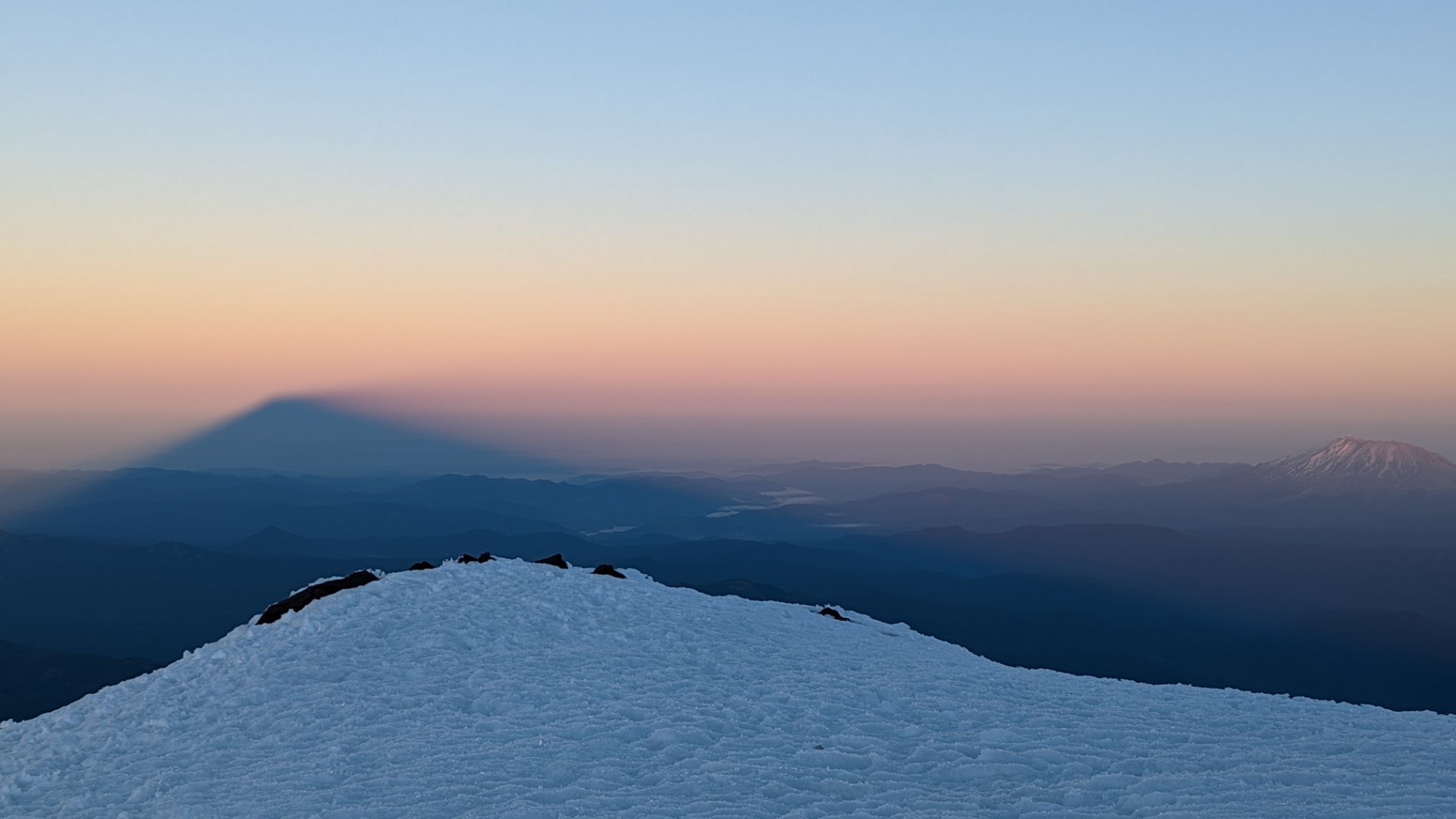 From the false summit we followed the bootpack below Pikers Peak and headed up to the summit. People who caught the sunrise from summit were on the way down. I opted to lead us more on the ridge where the snow/ice ramps made for easy switchbacking. My partner let me go ahead so I could get started with radio. I summited just before 7am.