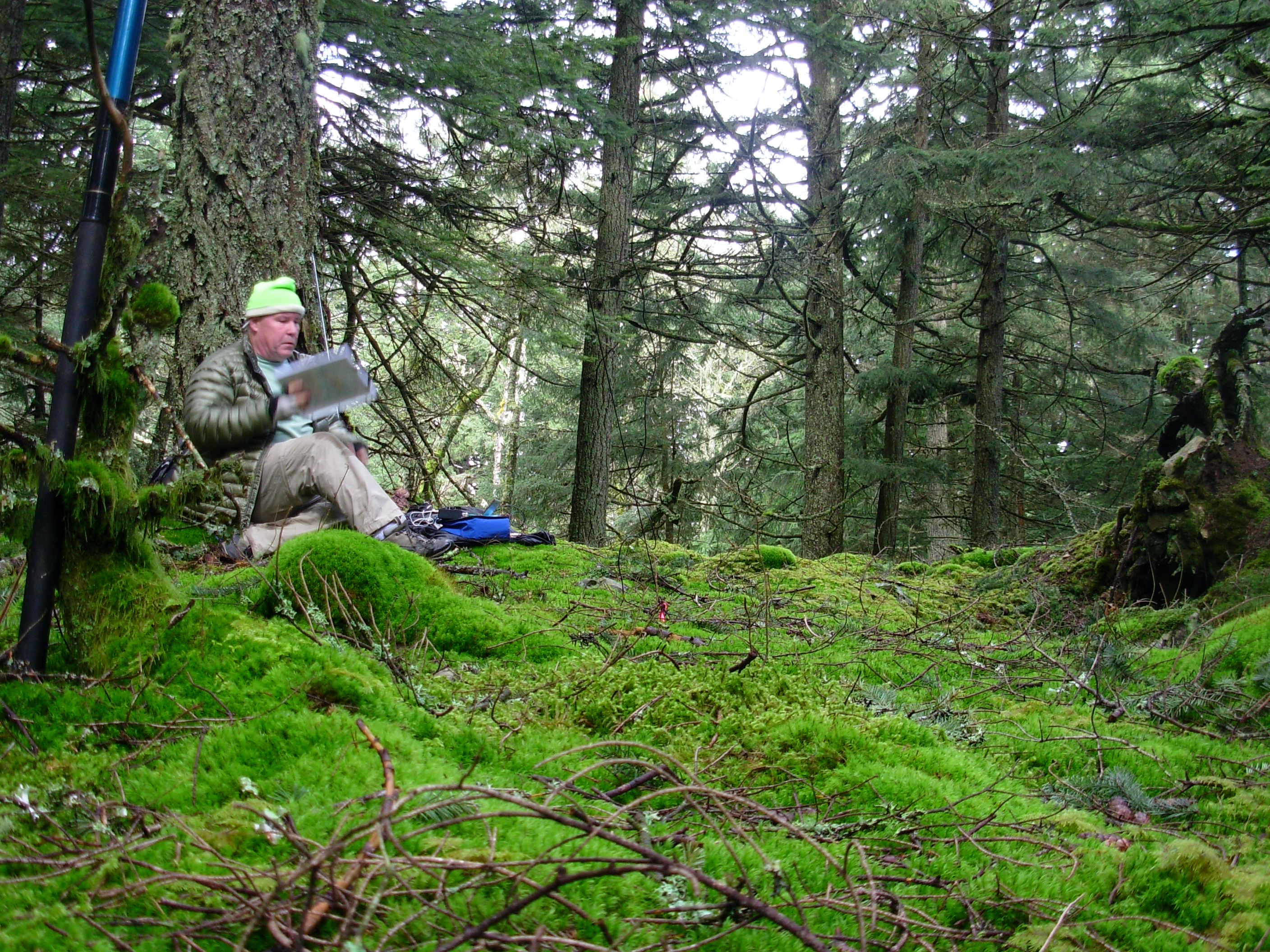 Walking now, that treacherous road changed character completely. The trail is a shady service road that climbs steadily to the forested peak. The winter debris of small limbs and trees were not really obstacles, and I was able to hold a steady pace. It took me about 1 1/2 hours to reach the summit where a convenient sign indicated the 1,750 foot elevation. I set up my dipole off the trail on a rocky landscape blanketed with thick moss. Sitting down against a sizable evergreen tree, I appreciated the soft ground and had a pleasant (if a bit late) summit activation with only a couple nearby owls keeping me company.