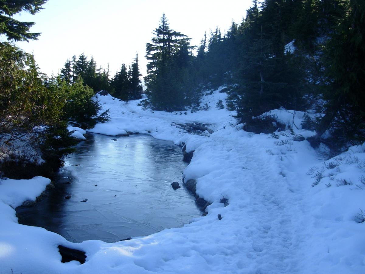 Current trail conditions are packed snow and ice. Probably more to come in the next couple of days. We didn't bring our Yaktrax and paid the price by slipping and sliding all over the place. Our ascent took too long, and the more careful descent even longer.