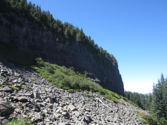The trail starts out on an abondoned road for 1 mile then turns steeply into the forest for about 1-1/2 miles until you come to a boulder field at the face of a basalt cliff. Boulder hop to the west thru the salmon berry bushes and descend for a while. Then start a climb again thru the forest with a sharp left turn at a trail junction. About another 1/2 mile to the ridgetop summit.