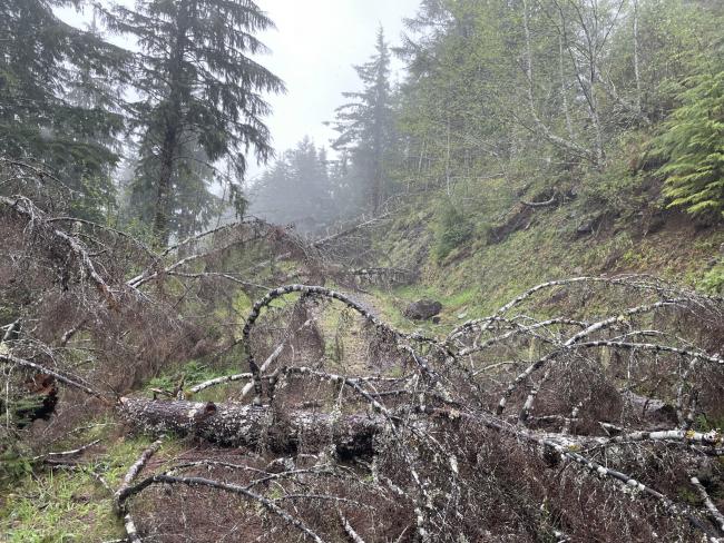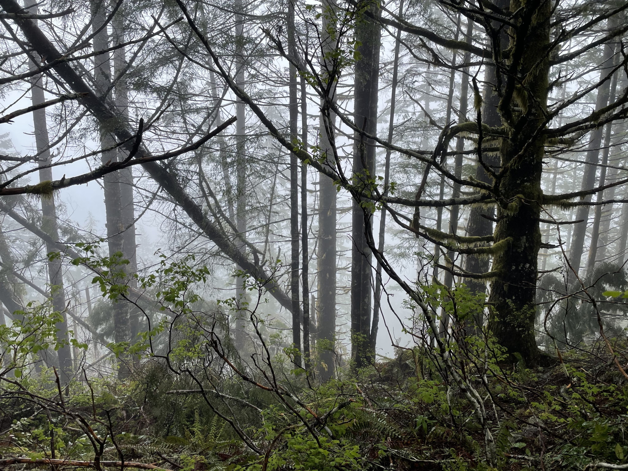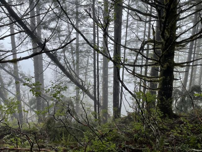 - Hike the remaining 1/4 mile through the blowdown to the point where the road meets the south edge of the peak ridge. This was about (45.65008, -123.72414) for me. Bushwhacking begins here.