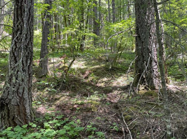 Once you reach the crest, continue directly east to the AZ. The ridge has a slight up and down, but direct is easier than trying to go around on the slope edge. This area of the forest has pretty low and open ground cover, medium density trees, and a medium level of windfall branches and trunks to navigate. Trail runner shoes are ok in the dry seasons, but boots and trekking poles to help stability while picking through some spots is helpful.