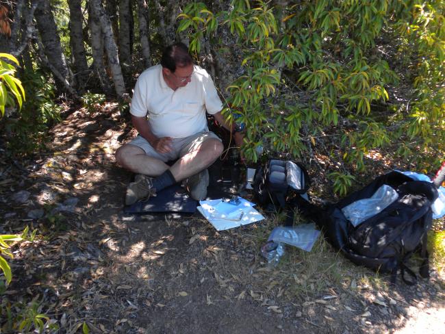 The trail switches back and forth a number of times as it winds up the mountain. It is about 1.25 miles to the top over a net altitude gain of about 650 feet. If you want a longer hike, you can start 4.7 miles further down the mountain. A number of interesting rock formations make up the summit, which has the remnants of a structure’s foundation. The views are rewarding in several directions. The Three Sisters are close by to the East. A number of trees on the summit afford some cover and limbs to hang wires from. It is a charming place to spend some time.