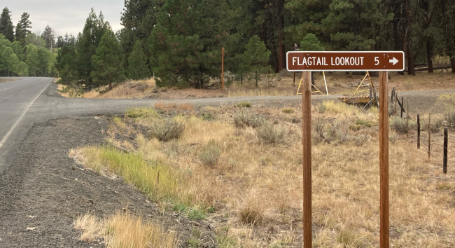 Don't know Flagtail Mountain is not close to any population center. You can get to it from John Day by traveling south on US-397 and then turning west onto Izee Paulina Lane. Travel this paved road to 44.1618, -119.2511 and turn onto a good gravel road. Drive about five miles to an active lookout.
