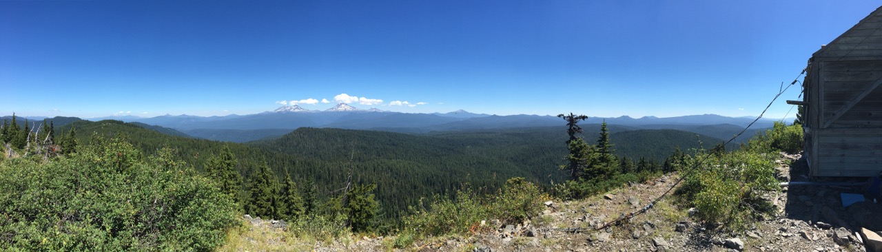 The trail to the summit of Olallie Mountain is 3.6 miles (7.2 miles round trip) with an elevation gain of approximately 1,200 feet. This trail is rated moderate (see Central Oregon Cascades hiking guide by William Sullivan which is a great reference) and is obvious in most places. The first half of the trail is a gentle climb through Douglas Fir/Hemlock forest, huckleberries, and bear grass. The second half of the hike is where most of the 1,200-foot elevation gain occurs. The trail switchbacks up to the summit. The summit is exposed and has a formerly used Forest Service lookout building (not a tower). The building is secured by cables and protected with lightning rods. The summit provides an exceptional panoramic view. The day was clear and we could see Mount Hood to the north, the Three Sisters to the east, and Mount Theisen to the south.
