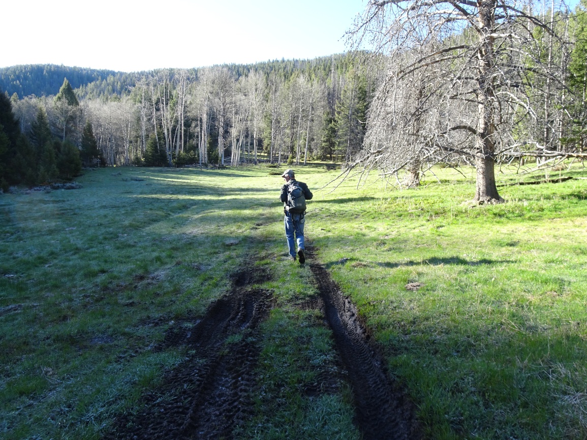 Hike up the ATV trail to a beautiful meadow with the wreckage of an old car where the trail splits.  Continue straight (right) and follow the ATV track as it climbs up and to the left, then back to the right (west).  The ATV track will intersect a good 4wd road near the ridge crest.  Turn right (northerly) and follow the road beneath the power lines to an old Quarry.  Leave the road to the right (northwest) near its terminus in the quarry and sidehill to the south saddle and ridge of Bear Mountain, crossing the barbed wire fence that is near the quarry.  While the first portion of the bushwack is young, thick lodgepole, it quickly improves to become an open lodgepole forest with a floor of grouse whortleberry and grass.  Follow the ridge up & bypass the large rock outcrop near the summit (see photo) on the right (east) via a steep earthen gully.  Upon reaching the summit ridge, traverse approximately 100 yards northeast to reach the actual summit.