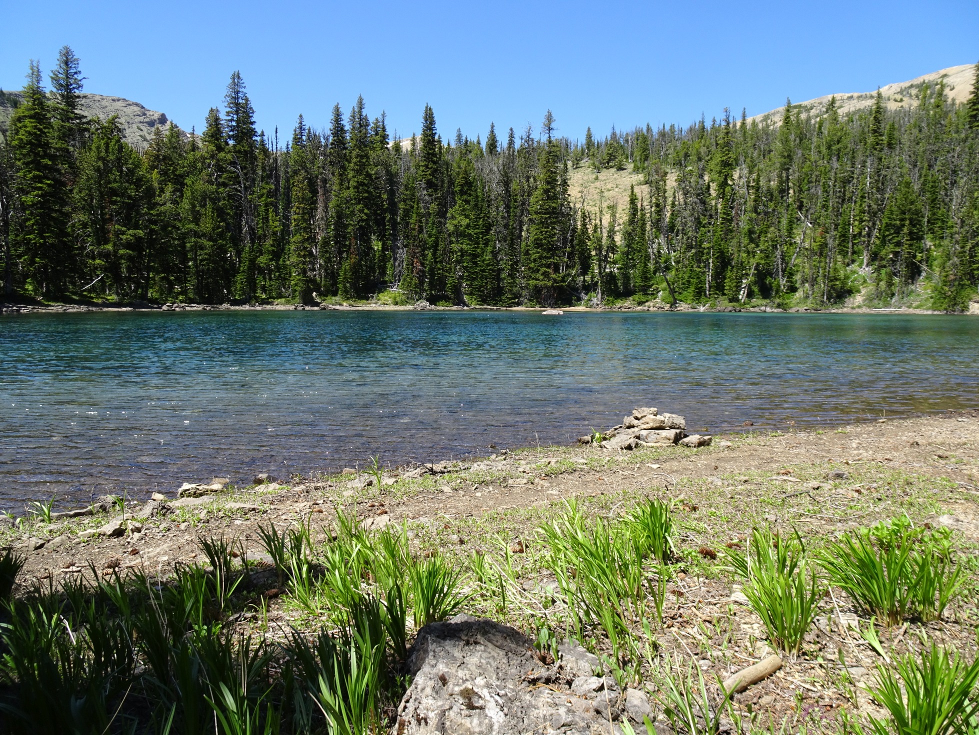 Bighorn Lake is in an 800-foot deep hole. Although it isn’t an efficient location – it is a nice one. The Lake is loaded with fat cutthroats and has nice shade trees on the northeast side. There is also camping in a burnt area near the outlet, although one must be mindful to stay clear of the standing-dead snags from the 1988 Canyon Creek fire. We had one trouble here – our tent and mattresses were damaged/destroyed by a critter while we were climbing Caribou. The claw marks, head-holes, and partially dragged sleeping bag implied a wolverine – but it is hard to say.