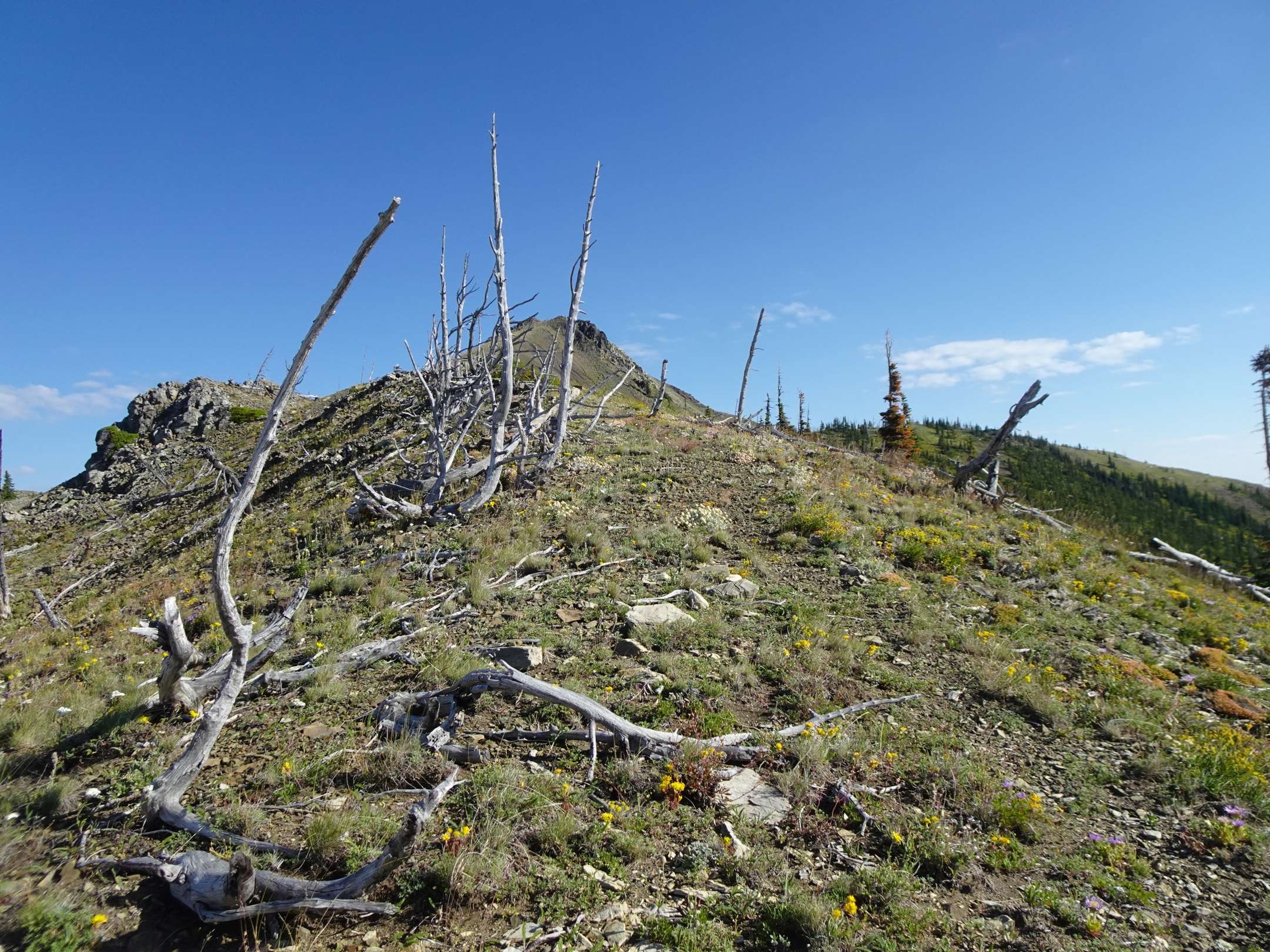There was a fire lookout camp on the summit (c.a. 1941). Some of the heavy 9-gauge galvanized telephone wire is still present near the summit.