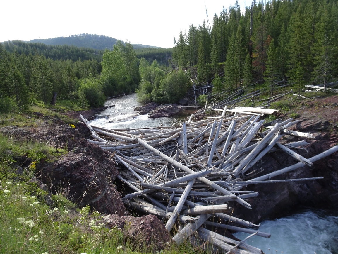Hike north from the N. Fork Trailhead. We turned left (west) on Tr. 061 (Lake Creek Trail) after about 0.6 miles to begin our big loop, but it is more direct to continue up the North Fork of the Blackfoot. Cross the two pack bridges, and turn right (North) after the North Fork Cabin to head up past the falls. Turn left at the falls and continue following the North Fork trail north as it heads towards the Carmichael cabin. The trail is cut into a sidehill for most of the distance, but it levels out on a sagebrush plain as it approaches the Carmichael area. This mini-plain is about 13.5 miles from the trailhead and makes a good basecamp for the Evans climb. The trail up the North Fork is heavily used and gets cleared to just beyond the falls early in the season, and to Carmichael not long thereafter.