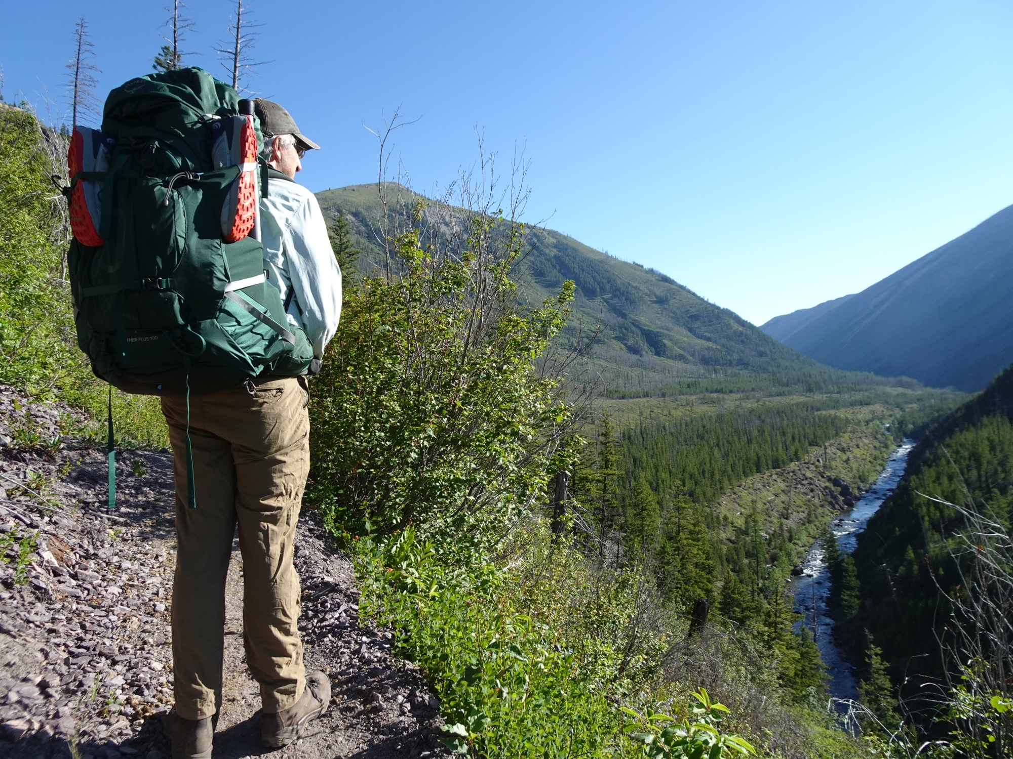 Hike north 6.4 miles on the well-traveled “Hobnail Tom” trail (Tr. 32) to the vicinity of the North Fork Guard Station. This trail is a well-traveled and highly maintained primary access point for the Scapegoat and Bob Marshall Wilderness areas. The trail crosses a packbridge across the North Fork of the Blackfoot River about halfway to the Guard Station, then a second packbridge immediately before the Guard Station. All of the approach hike is within the perimeter of the massive 1988 Canyon Creek Fire. Most of the area between the Trailhead and the 1st packbridge is within the perimeter of the 2017 Rice Ridge Fire.