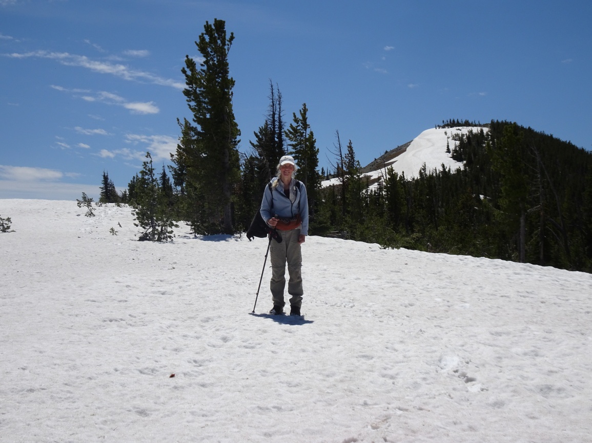 Hike north from the N. Fork Trailhead.  We turned left (west) on Tr. 061 (Lake Creek Trail) after about 0.6 miles to combine this summit with Spread Mountain (W7M/GA-079), but it is more direct to continue up the North Fork of the Blackfoot, and then turn left (west) up the Dry Fork after reaching the North Fork Cabin.  The trails up the North Fork and the Dry Fork are heavily used and get cleared early in the season.  Turn left (south) at Dwight Creek, cross the creek (it is a double crossing), then camp somewhere in the large sagebrush meadow area – there are many options.