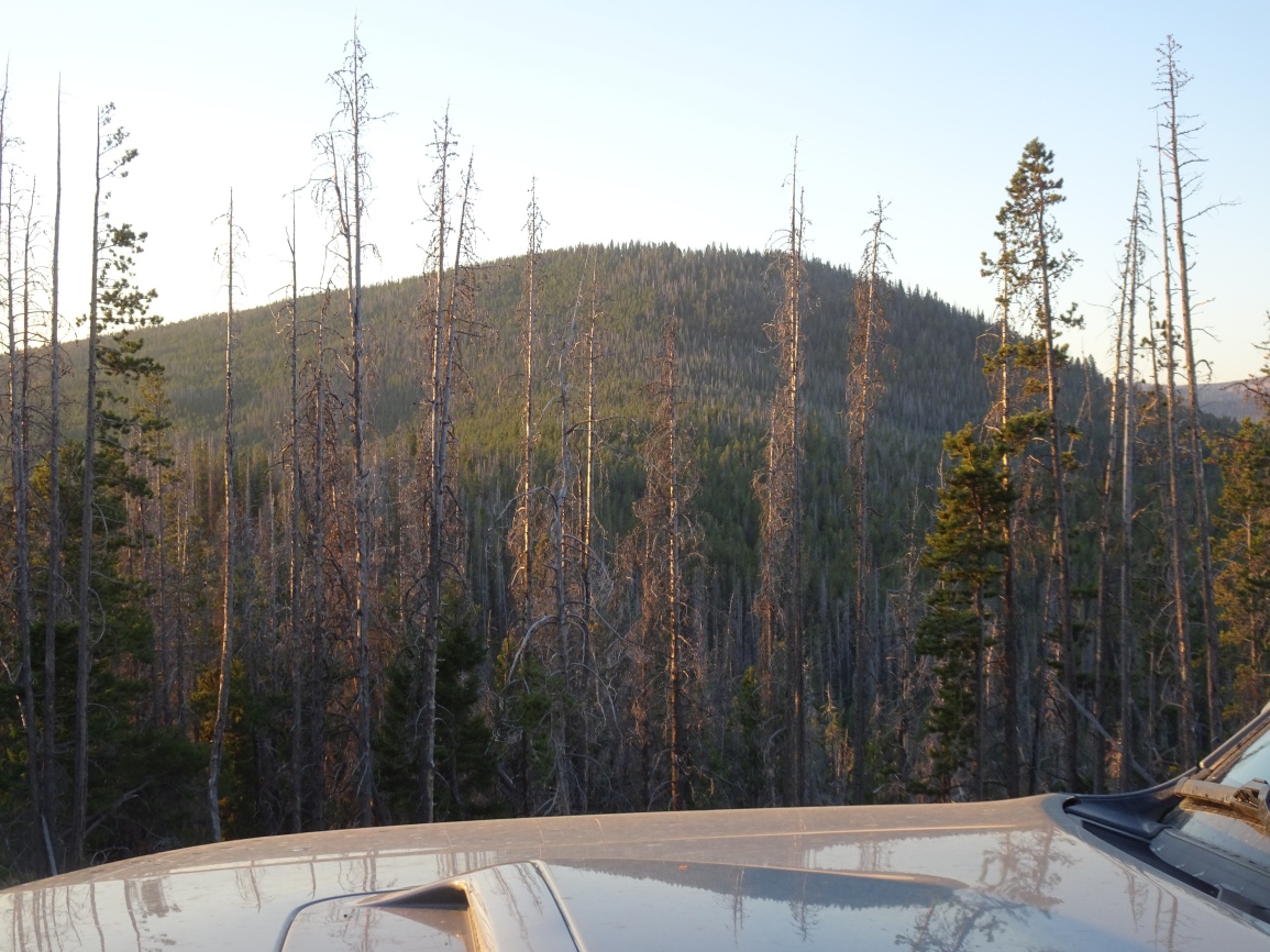 This is a pleasant hike through a thick lodgepole pine forest. The summit is a grassy meadow with some trees and views of the forested hills to the west. It is prudent to take a chain saw for the drive in, in case if the road is blocked. Note that the road is not open to motorized use from Oct. 15 – June 30. The road is suitable for all vehicles.