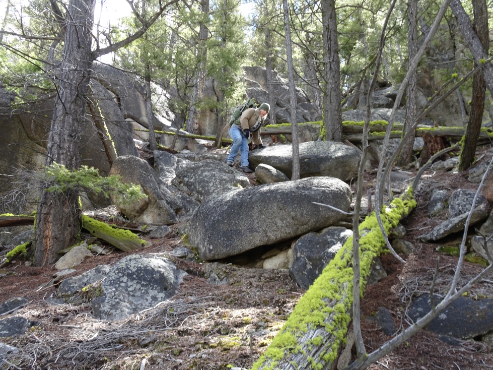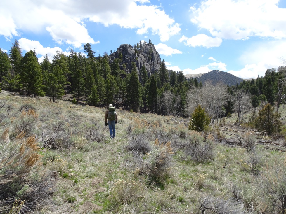 From the parking area, walk about 100-yards up (east) the gravel road and then follow the obvious path that heads up (north) the drainage between W7M/BR-155 & W7M/BR-150.  Follow the path up the drainage & then turn right (east) & climb off trail up the right (south) side of the gully that bounds the north side of W7M/BR-150.  Leave the gully when you near its head & climb directly up to the summit.  The climb is steep in spots & you must navigate around several boulders, but there are no particular difficulties.  The summit has nice views of the Humbug area, as well as the surrounding mountains & valleys.  It seemed possible to become rimrocked on the descent – but we always found an easy path around each obstacle.