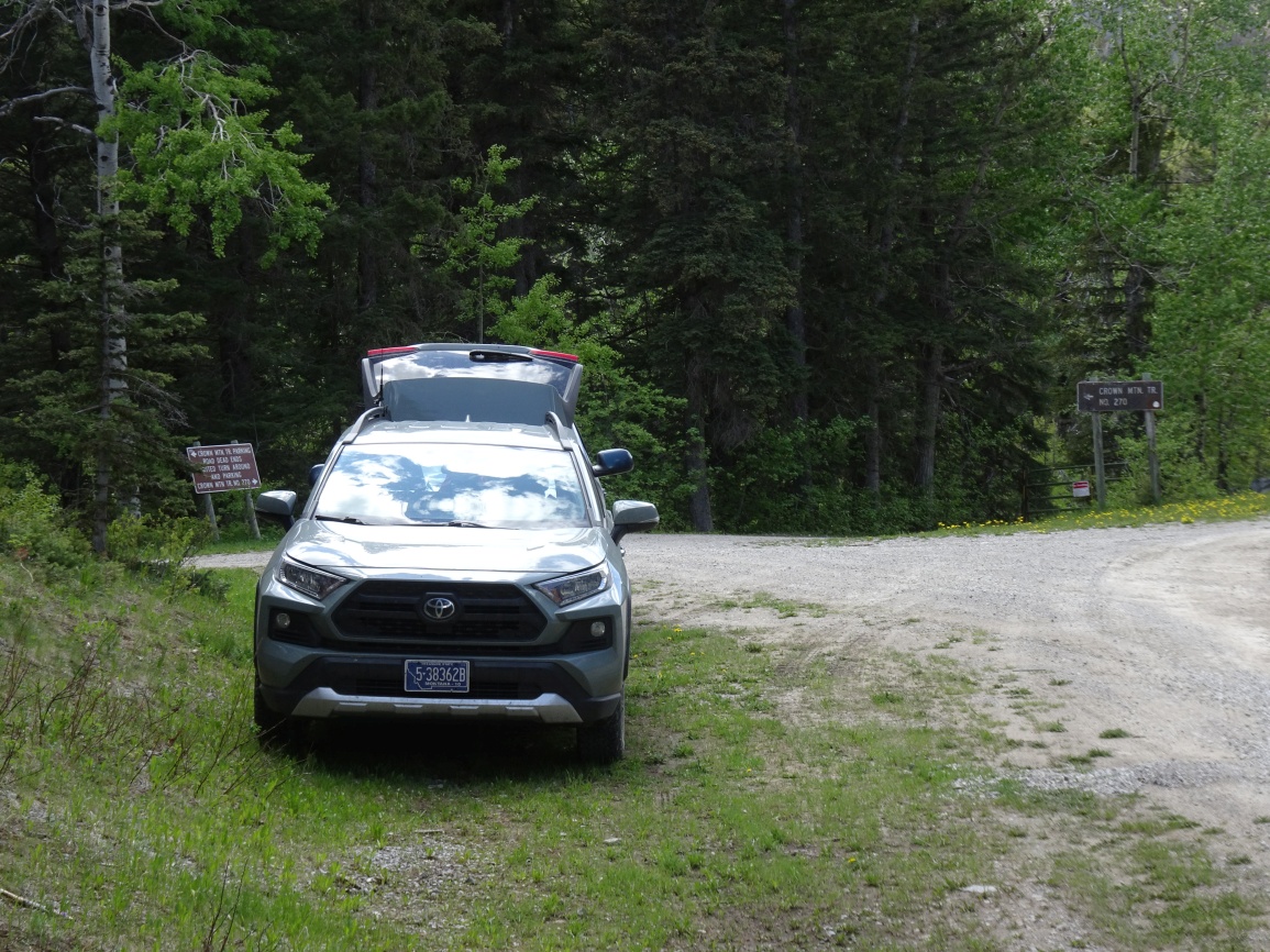 Beginning at the intersection of Hwy 287 in Augusta, drive southwest on the main street and turn right on the Benchmark Road at the edge of town. Follow the Benchmark Road west, over the dam at Nilan Reservoir, and on to the “Y”, 14.7 miles from the starting point. Turn left at the “Y” and continue onwards towards Benchmark. The Crown Mountain trailhead is 20.1 miles from the starting point on the left side of the road. While there may be limited parking down by Ford Creek, we found it easiest to park alongside the Benchmark Road. The Crown Mountain Trailhead (Trail 270) is well signed.