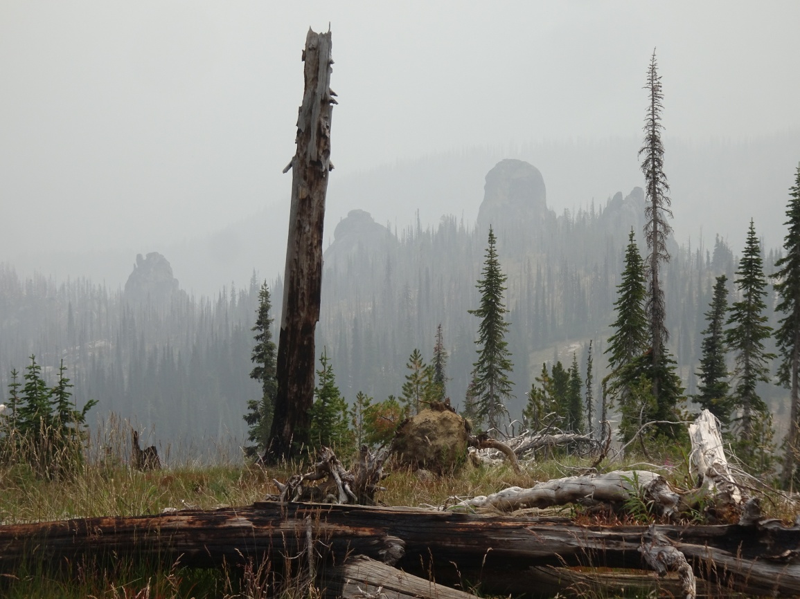 The trail is very well maintained and leaves from the east side of the parking lot.  Follow the trail over the shoulder of Elk Mountain, then down its north ridge through a pretty meadow, and onwards as it descends towards Bilk Mountain.  The trail switchbacks steeply down the east side of the Elk-Bilk ridge, then contours around the south slopes of the Bilk SE-Ridge before climbing back up to a trail junction in the saddle on the southeast ridge of Bilk.  Turning left at the trail junction will take you to Bilk Mountain.  Continue over Bilk Mountain and down to Grave Meadow where there is water and good camping.  Most of the area between Bilk Mountain and Indian Park is in the 2017 Buck Lake Creek burn.  Peak 7540 is in the 2003 Pack Creek burn.