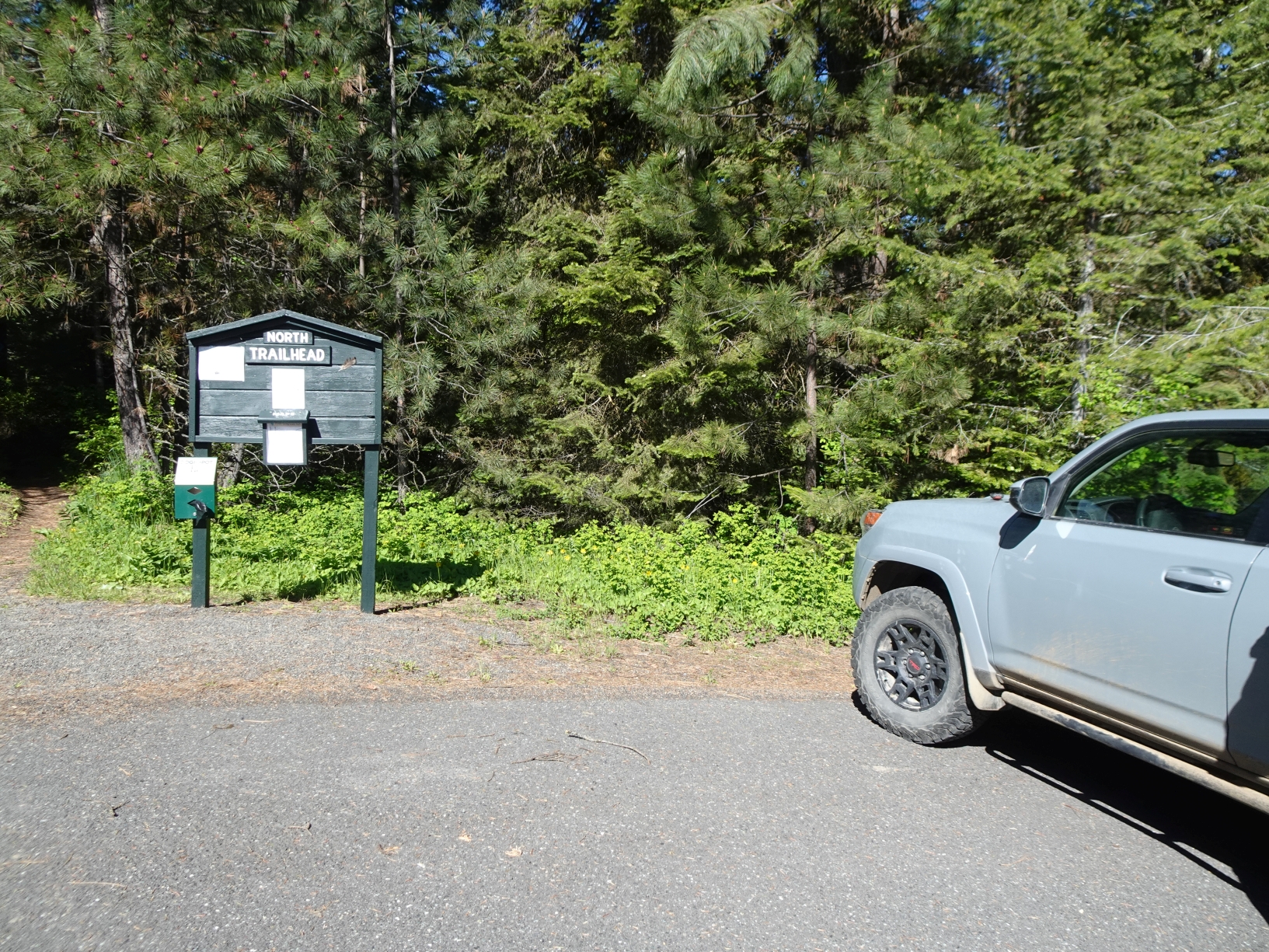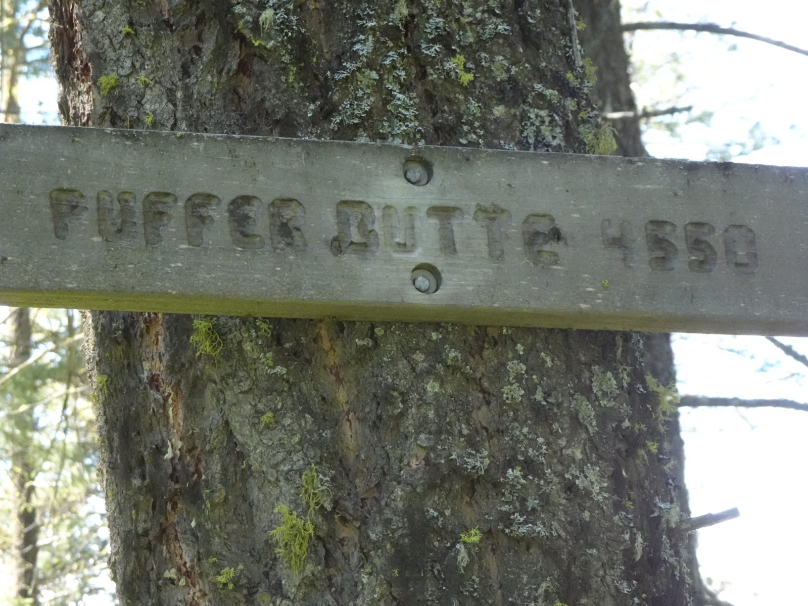 Option-1: This is a nice forest walk up the north side of the Butte. It is also likely the most efficient path to the summit. Park in the large parking lot and hike up the signed trail that leaves from the southwest side of the lot by the large signs. The trail intersects a two-track road at elevation 4,100. Continue straight across the two-track on the footpath. The path will climb at a steady rate before cresting out on the ridge. Once the path crests out, it continues another 0.3 miles before it passes below the summit (the summit will be a short distance west – to your right). While it would be easy enough to go off-trail directly to the summit, we chose to continue a short distance further south to the sign in a large open meadow, then double back to the north to the warming hut, and beyond to the summit (which is a short distance off-trail). There is a wooden “Puffer Butte” sign nailed to a tree at the true summit. Note that the sign in the large open meadow (north of the warming hut) is at the junction between the trail that we ascended up the north side, and an alternate trail on the east side of the butte that descends to the Puffer Butte Lodge. This path is not as heavily forested and has nice views to the east. The foot trails are marked as dotted lines on the Field Springs State Park map.