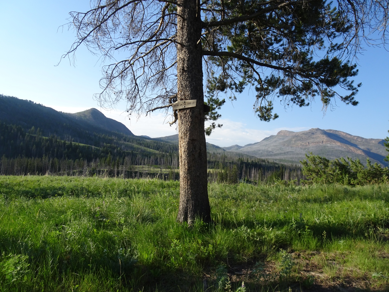 There is trail junction about 3.6 miles up the Bear Creek trail at about elevation 5,830. The junction was marked with the remains of an old USFS sign in 2021 but is not marked on some maps. While the official trail doubles back east before switchbacking to the west, it becomes very faint and is not well cleared. We found it much easier to bushwack straight up the hill about 100 vertical feet to a well-defined horse trail that parallels the Bear Creek Trail for about 0.3 miles before ascending to the Bear Creek – Glenn Creek saddle on the west side of Sheep Mountain. We turned left (west) shortly after crossing the Bear-Glenn saddle and continued up the south side of South Glenn Creek until we reached a good campsite, which we used as a base camp.