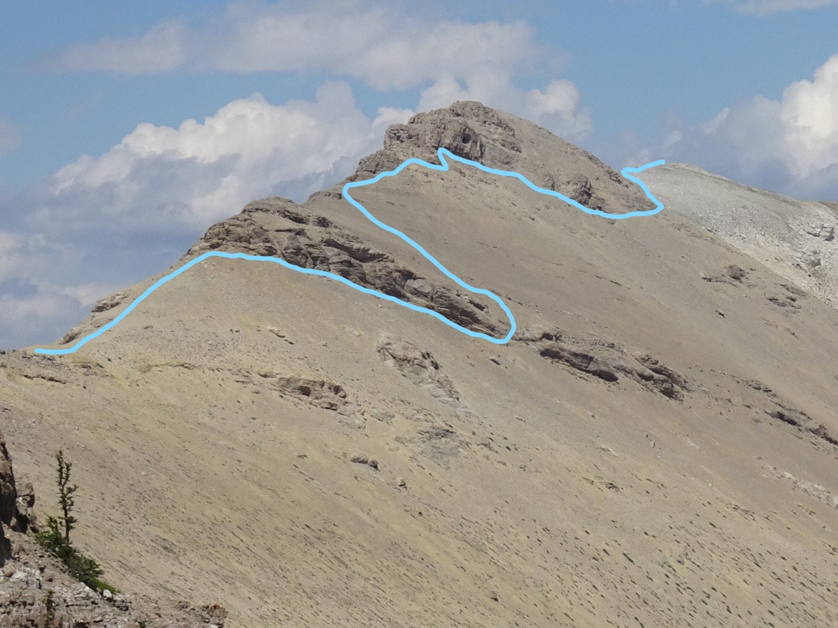 To climb Slategoat Mountain, ascend the broad sloping basin from the South Fork of Glenn Creek to the pass with Grizzly Gulch and enjoy the stupendously beautiful views of the Chinese Wall and the surrounding area. From the Glenn-Grizzly pass, continue north up the ridge. We ate breakfast here while watching a grizzly bear feeding in the aptly named headwaters of Grizzly Gulch below, then continued down to a saddle, then up a steep talus slope to skirt the edge of Peak 8642. Continue along the ridge and skirt the right (southeast) side of summit 8732 to reach the White Ridge. Follow the White Ridge northeast to the summit of Slategoat Mountain. We found this portion of the climb to be very slow, with many cliffs that required circumvention (usually on the southeast side) and much talus. We downclimbed a considerable distance beneath the southeast cliffs of peak 8842 before finding a good path through the cliff band and up to the summit ridge. The approximate path (as I recall it) is sketched on a photo.