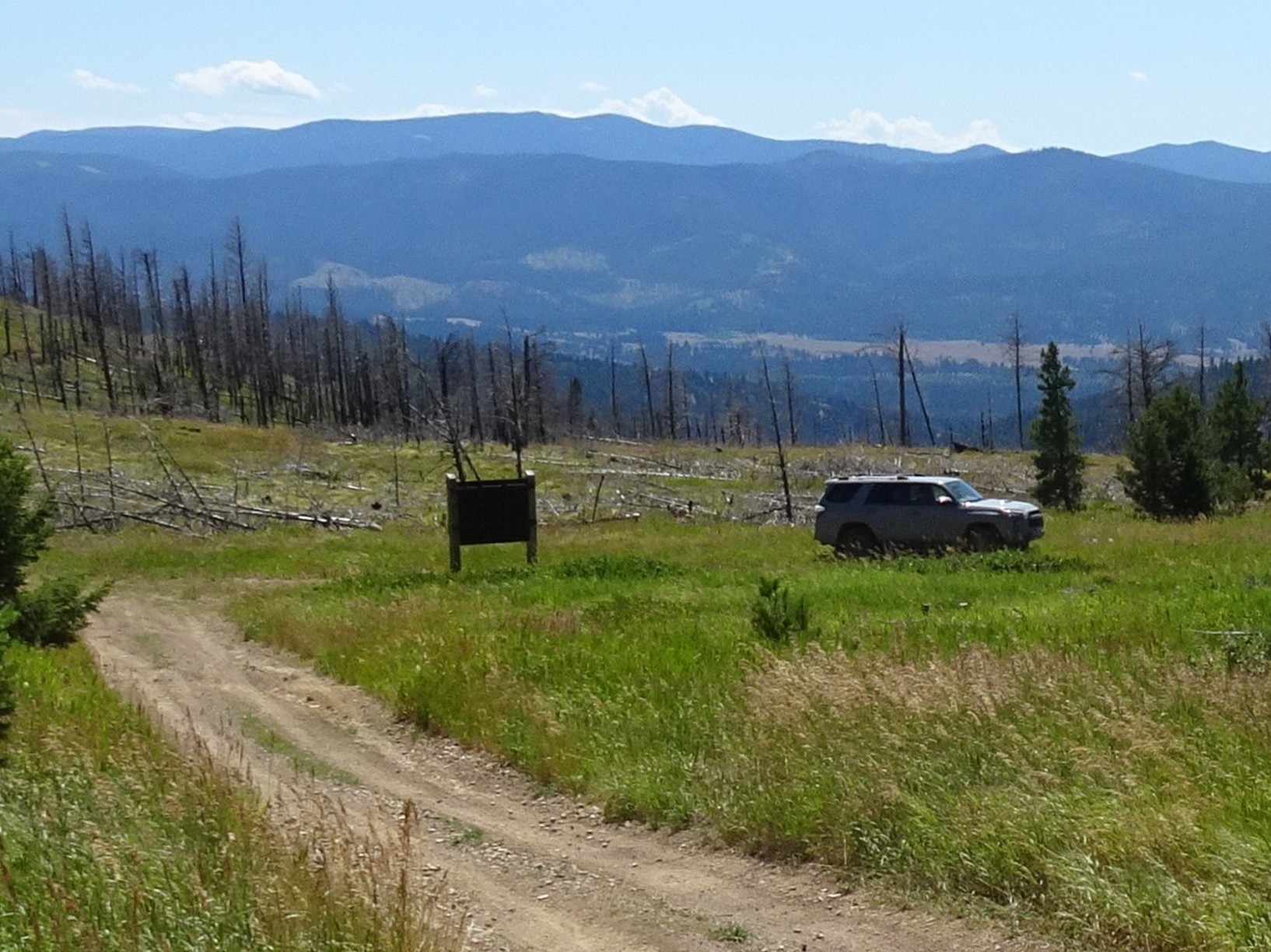 Take FS-1800 north from the East Side of Lincoln.  Set the odometer to 0.0.  Turn left at the hairpin (7.5 miles) onto FS-1821 (Open to Full-Sized vehicles July-1 to October-14).  The parking area for full-sized vehicles (11.6 miles) is at a road junction in an open meadow.  Hike north up the OHV trail and follow it 6.0 miles to the summit.  The OHV trail is seldom rocky and would likely be suitable for mountain bikes, although it is steep in spots.