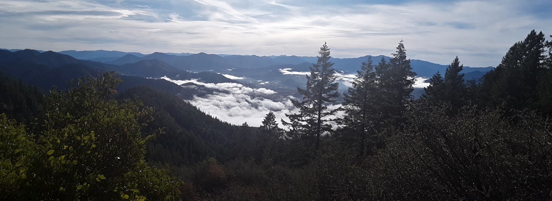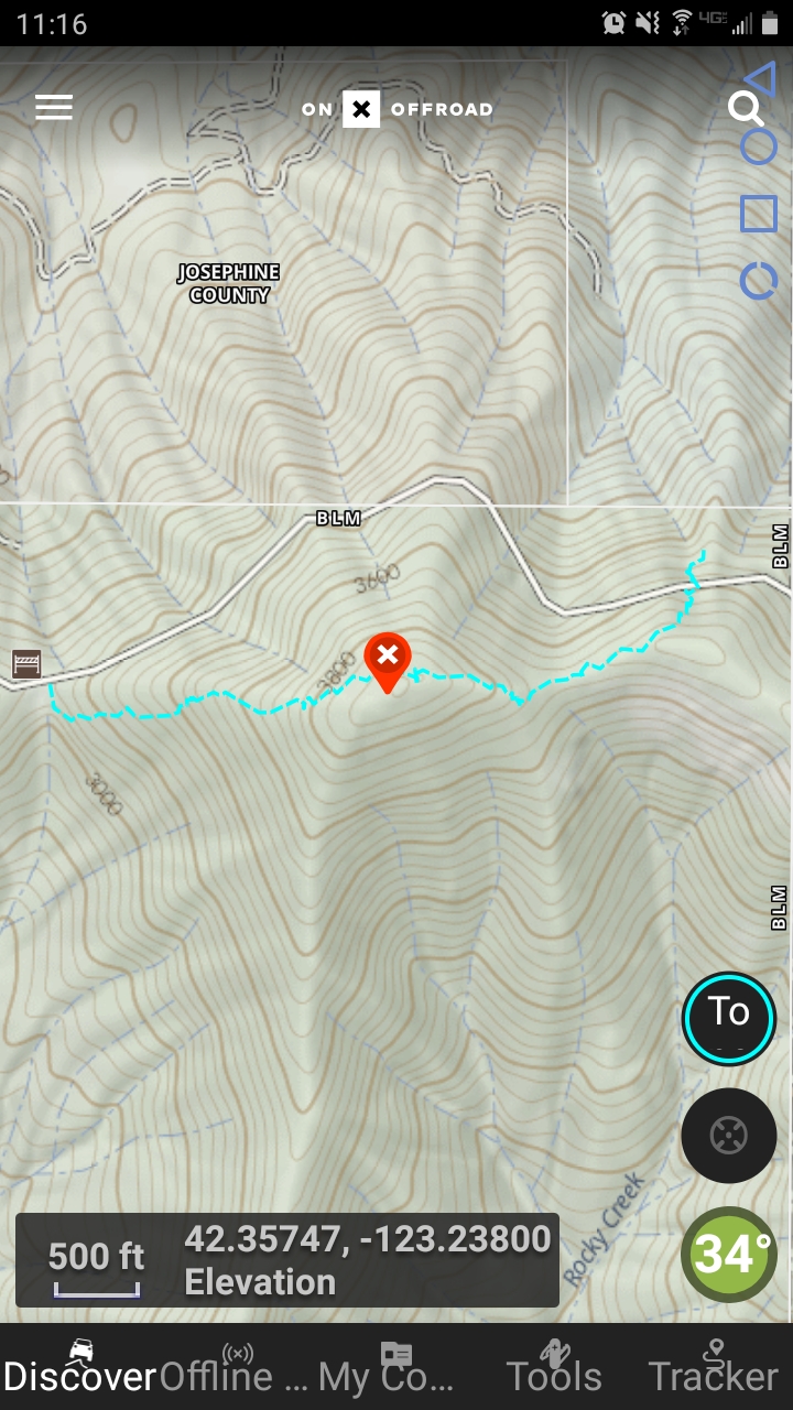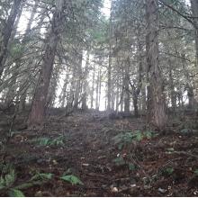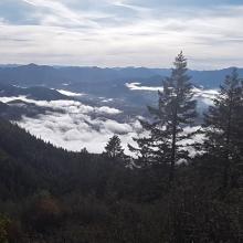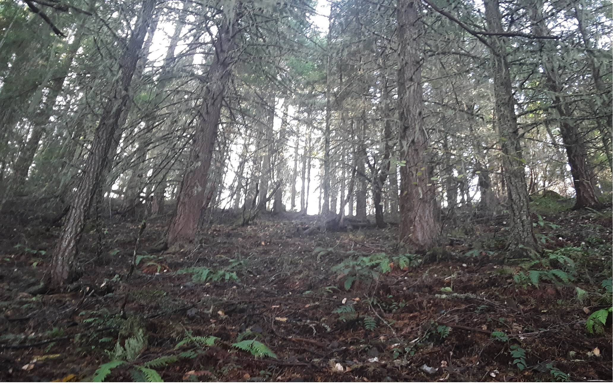 This was #2 of 3 that I did outside of the town of Rogue River during a day trip. This one was a killer. When I click treacherous trail it is because there was none. I drove the main road (BLM 37 5 1) until what seemed to be the highest you could drive to on the north side but the bank is very steep and brushy so it was difficult to find a good starting point. And boy was it hard. This hill is mainly fist sized rock that is mossed over, crumbling beneath your feet, with a very steep angle to climb. It was difficult to stay upright. From this path, you will get to a saddle, sort of a false summit, then keep going west. Not too far from the summit there was an open mining shaft that I could not see the bottom of so be careful! Forested summit but some nice views going up. I chose to come down the west pointing ridge rather than back tracking as it seemed a bit dangerous for me. It came to about 1.5 miles basically going from the east ridge up, west ridge down with 600' gain, most of which is climbed the first and last 200 yards. This one isn't on my favorite list...