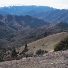 There are a couple ways to get to Baldy Peak and I think I took the longer route with more gain. I really wasn't sure if I would get this high with snow levels so didn't even pay attention to the other but when I was there a couple others were on trail too from the other side. You will have to go off trail to do the final climb which is a little crumbly and steep. I chose the ridge line partly in some vegetation so the ground didn't slide so much. It was overcast but I can tell it has a fabulous view. Wasn't bad even with the clouds. I took the Charlie Buck/Baldy Peak Trailhead. It ended up being about 1600' gain in about 1.1 miles up. Pretty steep but a good trail. There was poison oak too but not too bad.