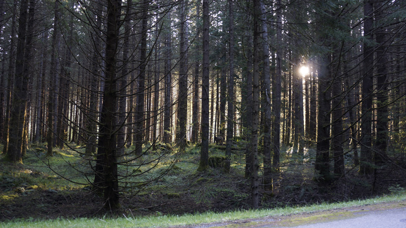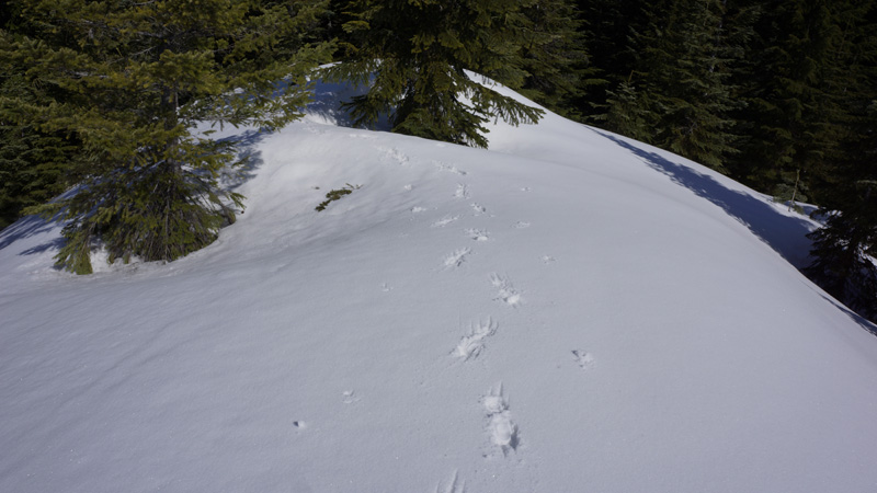 During my way down I try to stay in the forest longer. I cover my wound on my left hand with some resin. That has a very nice smell. The snow outside of the forest is very slushy and I am sinking sometimes up to my knees. Once I reach the open area I swap the crampons to snowshoes. A chipmunk next to a forest road.
