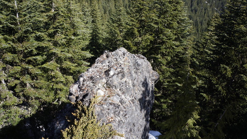 On my way down I choose a different route. I descend inside the forest. The slope even here is very steep, at least 45 degrees. Using my ice axe and hope that it will not end with a big rock wall. Luckily there is no wall here. As I got some elevation down I orient myself towards the saddle. So I go round those parallel narrow rock walls. Once I reach the saddle I am very happy. Danger is over. From here is all fun and laughter to get back to the car. On the picture is my route. Photo was taken 2 days after from Huckleberry Mountain.