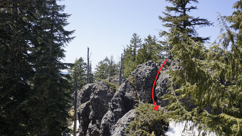 The summit is just blocked by the tree. The red arrow depicts the location where I lowered my knapsack with a 15ft 5mm rope. I use this rope to hang the Yagi from the fishing pole. Once I had no weight on me, I was able to easily climb down in that crack. The height of the wall is approx 6ft.