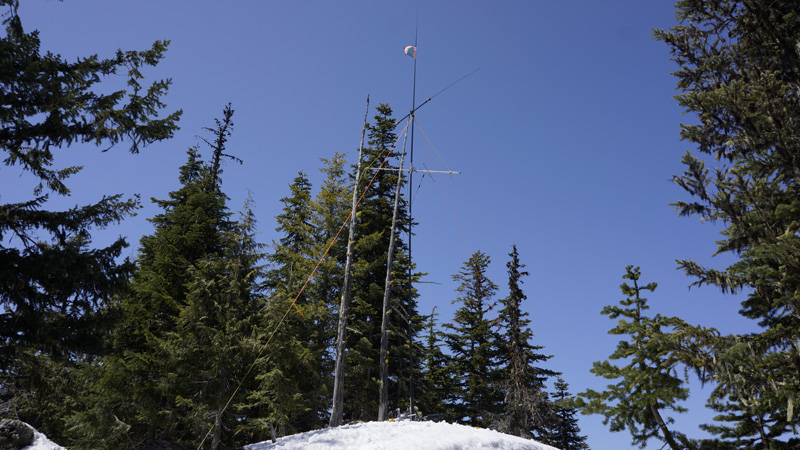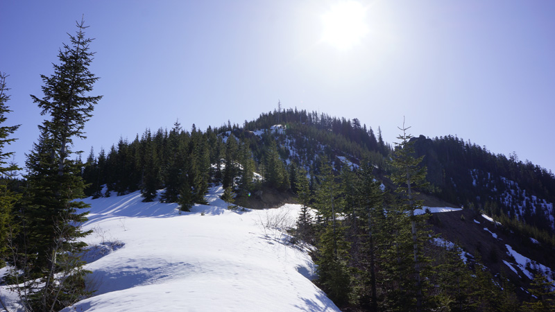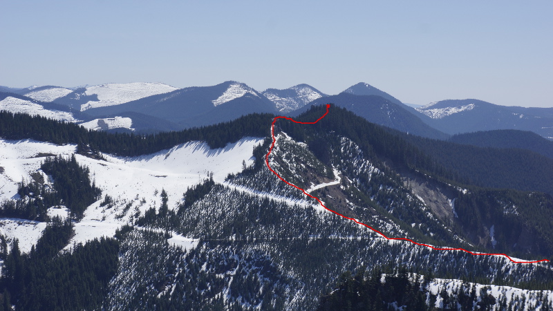 Made a good progress on the snow covered forest road and soon reached the ridge line. Off course I hardly had to walk any serious distance and there was no significant elevation gain either, so this fast progress is understandable. This is exactly what I wanted. Get out and have only a short distance walk and some QSOs. Well, it turned out a little different. There are pine trees in the middle of the picture. To left the Divide Ridge trail, which here goes below the ridge line. To right an old logging road. I am hiking in between staying on the ridge. Climbing the first summit, descend back to the col and climb the second peak which is the SOTA summit.