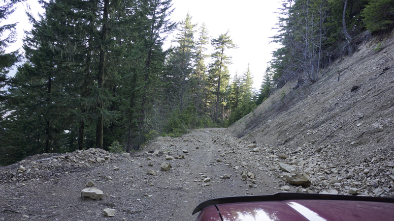 Forest roads can pose different dangers like trees across the road, wash outs, mudslide and rock fall. Here is a small rock fall across the road on my way down. I think I should get at least a chainsaw into the car.