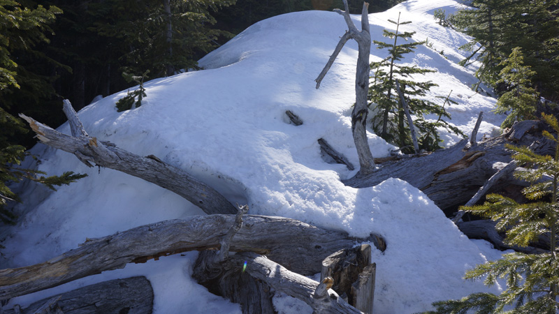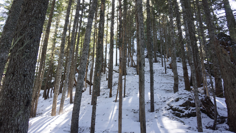 Old tree blocking my way. It was not that bad right now. It will be much worse on my way back, when the snow will be slushy and you have to be very careful with each step.