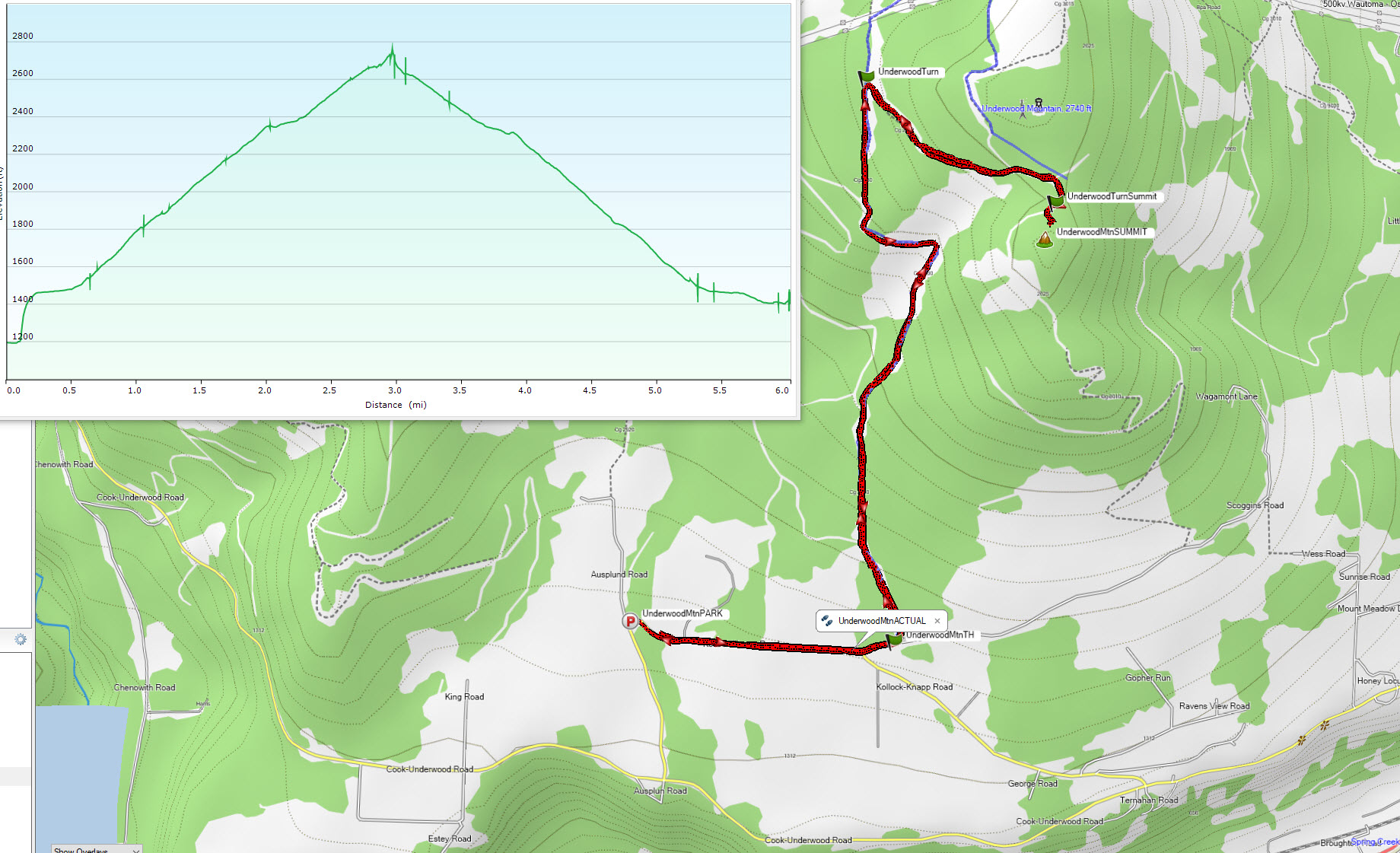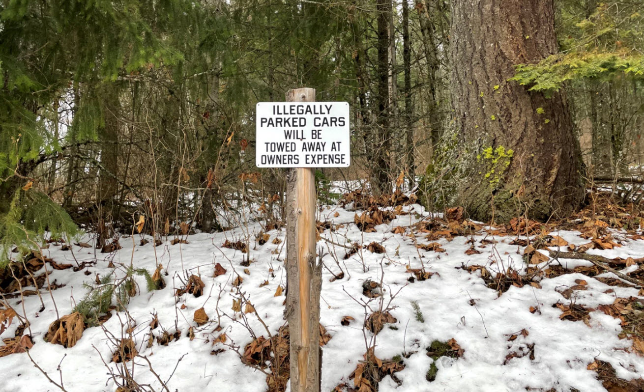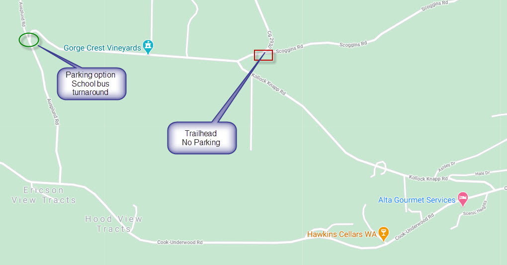 It appears the neighbors are fed up with people parking at the trail/road start point, with “no parking” signage very visible. I parked a little over ¼ mile away at a school bus turnaround at the intersection of Ausplund Road and Kollock Knapp Road (see image) and walked to start point. There also looked to be parking along the south side of the road across from Gorge Crest Vineyards.