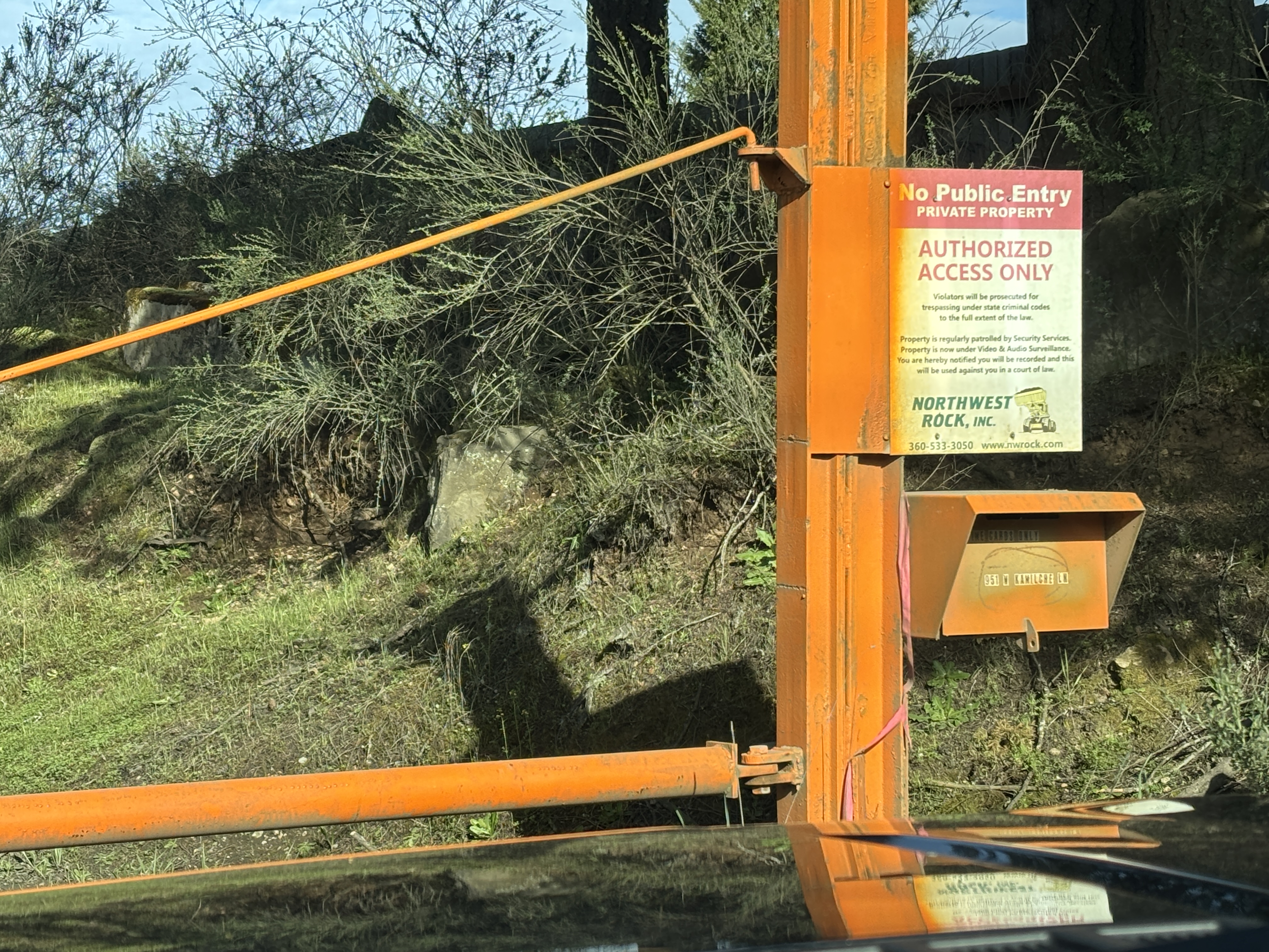 It has been many years since the first activation of this summit. Since that time it appears a Rock Quarry is now in place and the main access road is marked "No Public Entry" It appears that there is Green Diamond land behind the quarry, but could not find an alternate route to get there. The gate is open during the week for quarry traffic, but locked on the weekends. Pic below of gate and sign.