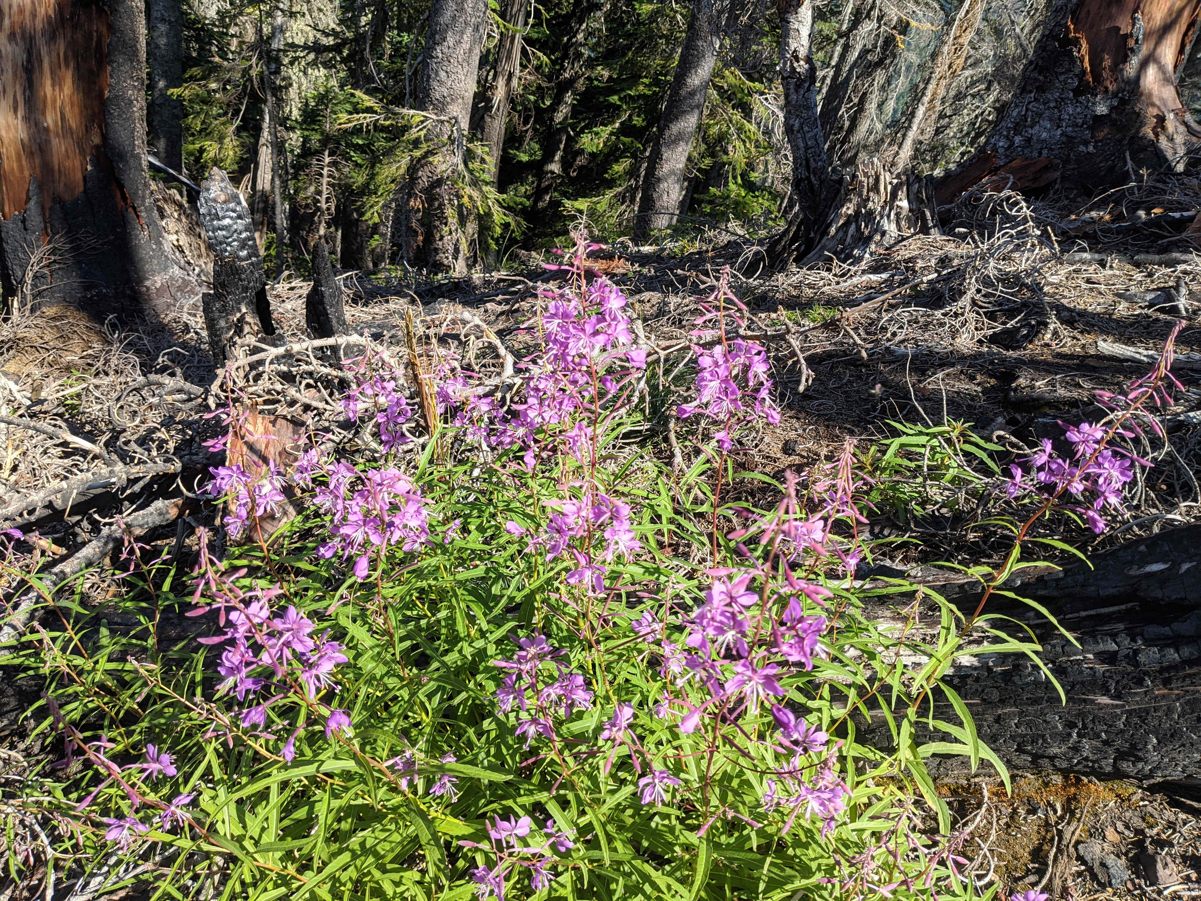 East Crater is a peak in the Indian Heaven wilderness. Three years ago, the south side and ridgeline of East Crater were completely burned by a fire that ended up burning about 500 acres in the area, and this fire caused the evacuation of the entire Indian Heaven wilderness area in September of 2017. Not much has grown back on the south side, while the north side, essentially untouched by the fire, is thick with trees. I did this activation in conjunction with Gifford Peak and Lemei Rock on a three-night backpacking trip, but this peak can easily be accessed from East Crater Trail with a trailhead a few miles to the east. We approached from the junction on the north side, where East Crater Trail meets the PCT, and headed west on the PCT for a few hundred feet. We left the trail at about 46.0029, -121.7893, and headed straight up (tending east). I don't have an exact track, but this route became thick with short trees about halfway up. It is still doable, but there are a few thick stands of young trees you need to push through. The entire ridge is in the AZ, between all the high points; the actual height variance is probably not much more than 40 feet, and this can be seen clearly if you head east along the ridge. The ridge rises to a bump at 45.9996, -121.7866 and then descends maybe 10-20' to another ridge that goes to the true summit - which is barely even taller than that bump. The west prominence is a reasonable activation spot, and the west side of the ridge has the best approach, as we found out on descent - we went from the western prominence of the ridge directly down to about 46.0016, -121.7938, and I recommend you follow the PCT around in a similar fashion before climbing. Right now, that approach is well-shaded but the ground is relatively clear of brush, and you will have a much easier (but still steep) hike up. The third approach you might consider is to come at it fully from the west, and this approach probably has the very best slope and lack of obstruction, but it ascends through the burnt forest and therefore does not protect you from the sun. I made 4 contacts on 2m FM, just managing the contacts with a broken Long Ranger. If you want a little more assurance of getting into Portland, take at least that much gain for VHF, and preferably a yagi; you have prominence, but also some obstructions in the way. You may also raise several hams in Stevenson and around.