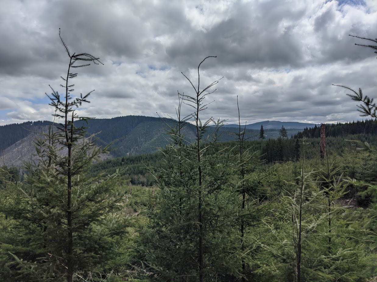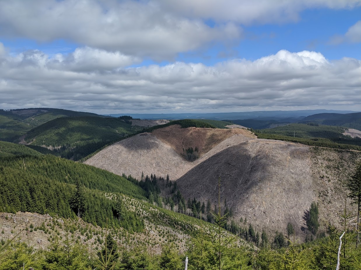 From here it is easy - walk across the bridge, turn right soon after, and then take the left branch of this road, marked on CalTopo as Green Mountain Road, most of the way up this mountain. You will see spurs to the left, and some spurs lead backwards to the right, but the first spur that climbs substantially up the mountain to the right will be at 45.8385, -123.4458, after two miles traveling along this main gravel road, and you should follow it. Up to this point the road is very shallow grade gravel, a major gravel road, and after this turn it is a well-maintained minor gravel road. You could drive up it in almost any vehicle, if you had permission; for our purposes, it is just a lovely hike.