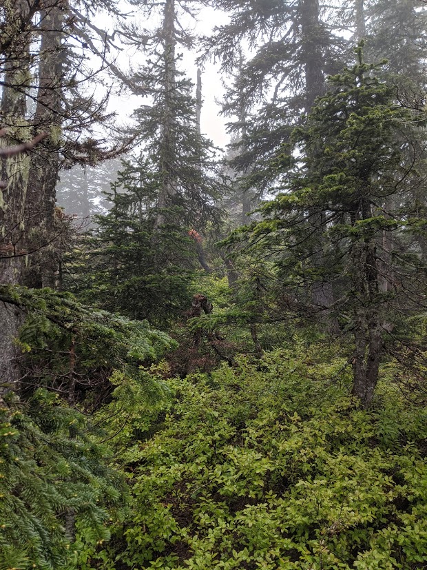 There is no clear path - you will be pushing through small trees and blueberries most of the way - but it is only a few hundred feet and a few tenths of a mile to the summit. Head from the clearing mostly north on the east side of the clearing, on the easiest path to the ridge, and follow the ridge along the path of least resistance. The ridge is the easiest path, usually, and the south side is much less steep (the north side is a cliff in places, it is not recommended). The summiot is two rock pinnacles, both climbable, at about the same height. I activated a little further into the trees away from that point, but I recommend taking advantage of all the height you can manage.