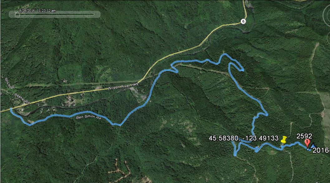 Take the Wilson River Highway 6 west from the turnoff from Highway 26. You'll go about 27.5 miles and turn left onto Ben Smith Road. You'll follow this road about a mile to turn left. You'll continue on up another 3.8 miles and ending up in small triangle of roads about 0.2 miles from the summit proper. I parked near 45.58380, -123.49133 and headed up a very steep motorcycle trail. Poles and good boots will be helpful to climb this track. There may be less steep alternative trails, but I used the shortest route. There is a bit of room off the trail at the summit where I set up. You are in close forest but there's enough room to set up an EFHW.