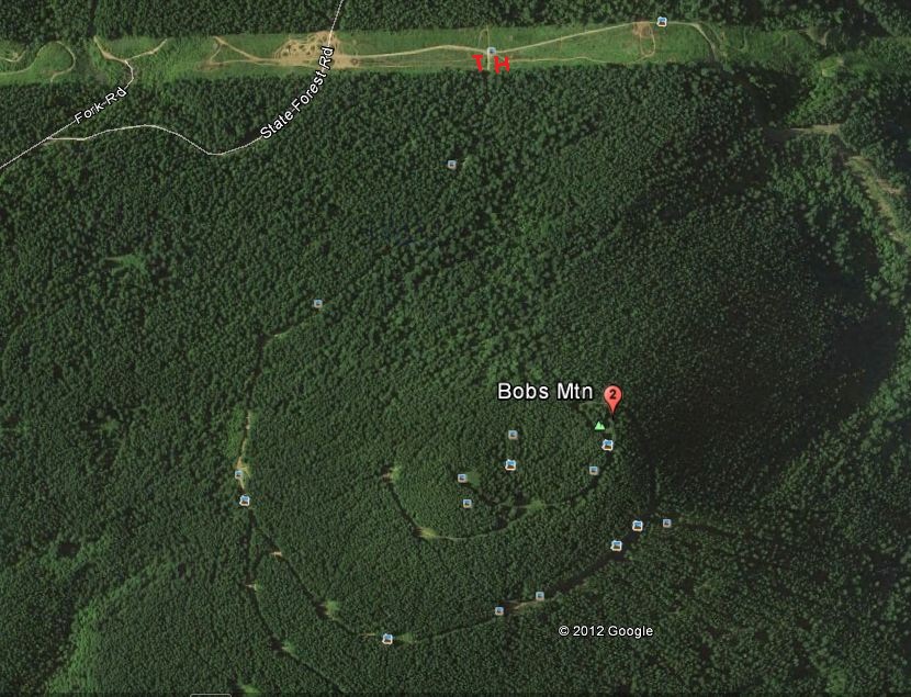 Drive under the power lines to the next "right turn" into the woods – about 0.2 miles. The trailhead is indicated by "TH" on the image below. It may be possible to drive a quarter mile or so up this road in most vehicles, but beyond that it is full-tilt four-wheel drive territory. We parked at "TH" and walked the pleasant 1.5 miles. Where there's a Y in the road, take the rougher, uphill route that leads to the summit. There's a good bit of room on the summit for antennas and operating.